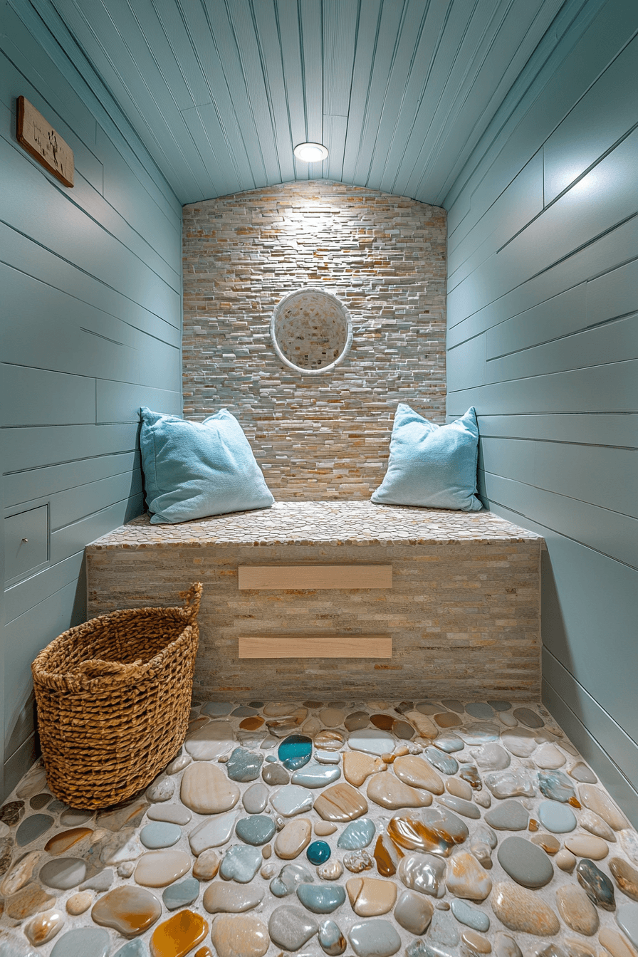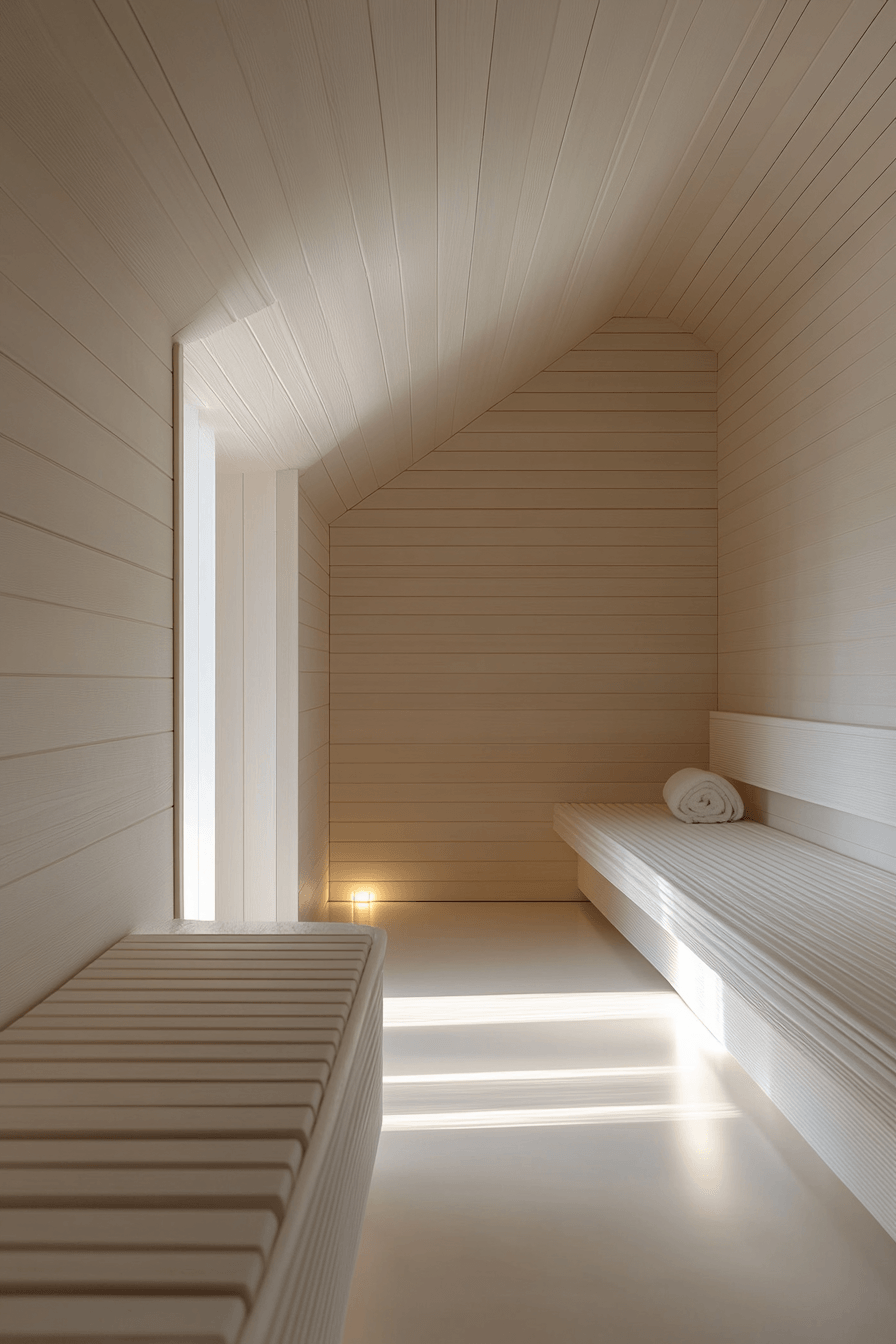 Light coastal tones inspire refreshing sauna ideas that feel open and rejuvenating. Soft hues echo the calm of the ocean. Natural textures enhance the relaxed vibe. The design feels breezy and inviting. These sauna ideas bring a sense of seaside tranquility indoors. Create your own coastal-inspired retreat.