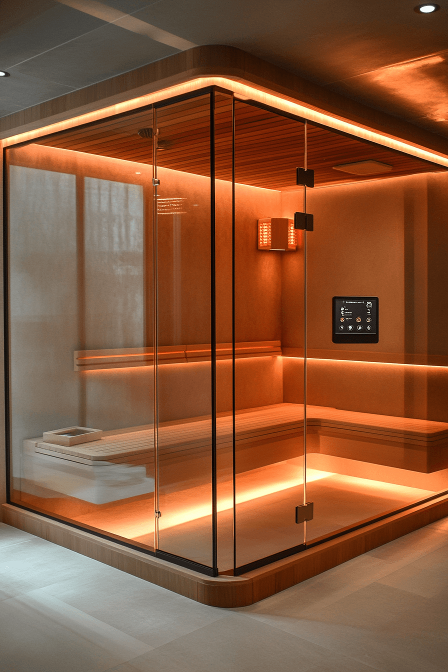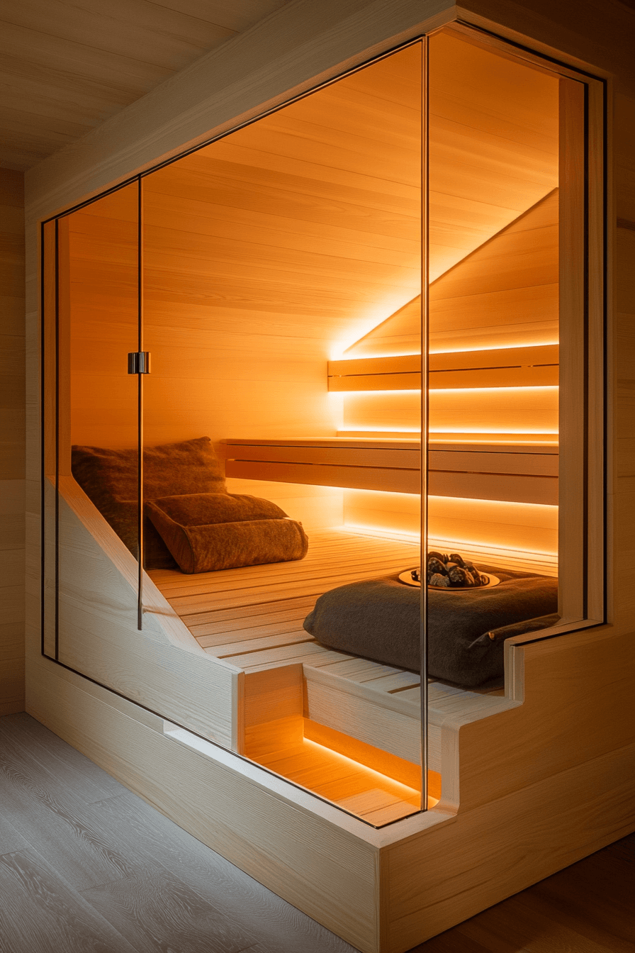 Reflective surfaces expand modern sauna ideas by adding depth and brightness. Mirrors create a sense of openness. Light bounces across the room beautifully. The design feels dynamic and spacious. These sauna ideas enhance both function and style. Discover how reflection can transform your space.