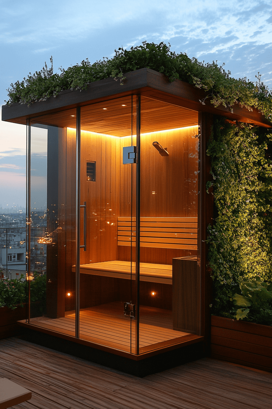 Elevated settings bring breathtaking views into sauna ideas designed for rooftop relaxation. The higher vantage point creates a peaceful escape. Glass panels connect the sauna with its surroundings. Natural materials keep the design grounded. These sauna ideas combine scenery with serenity. Turn your rooftop into a wellness destination.
