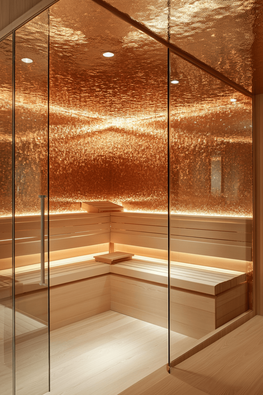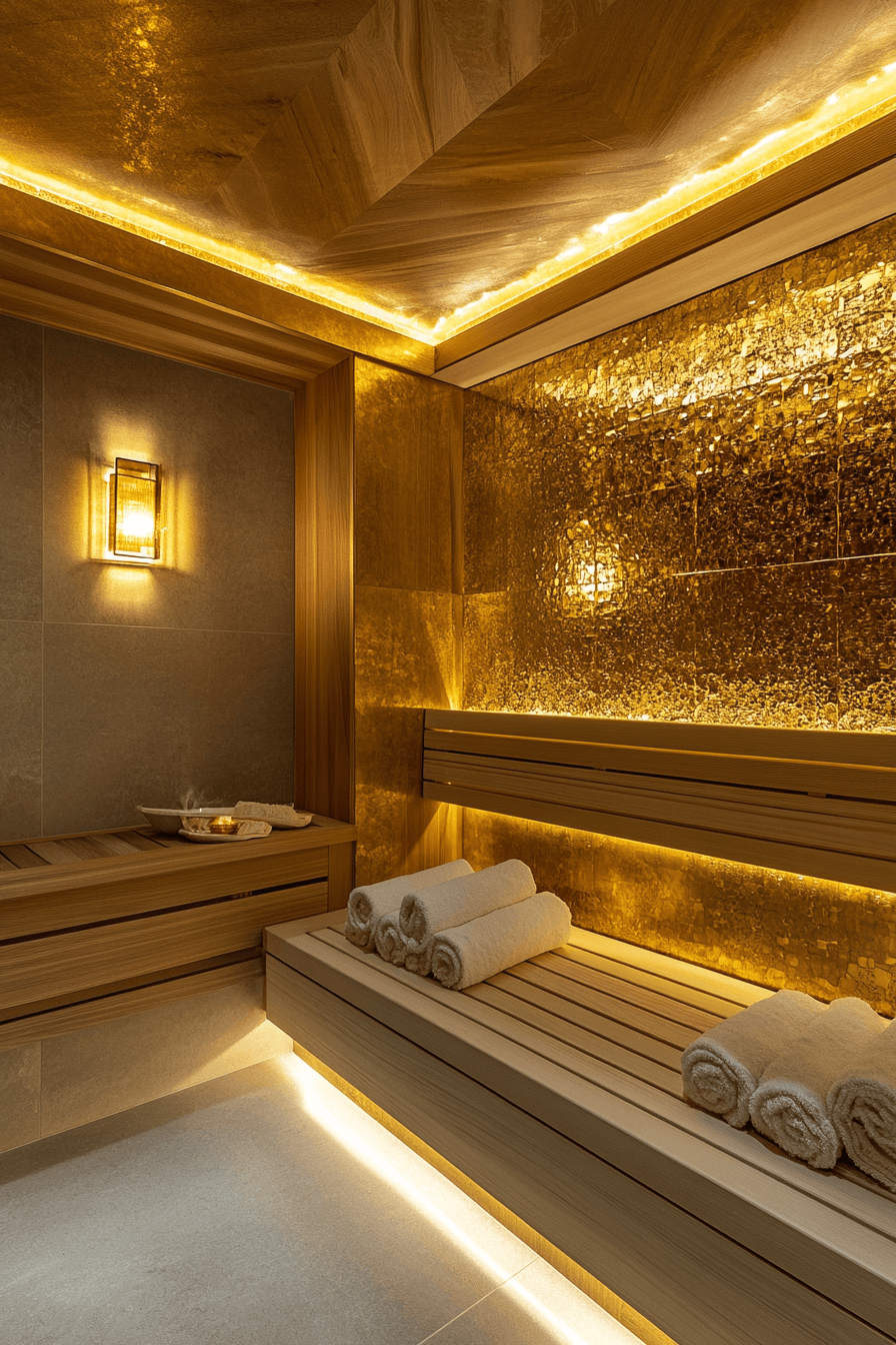 Metallic details add a luxurious touch to modern sauna ideas with refined accents. Gold elements introduce warmth and contrast. Soft lighting enhances the overall glow. The design feels elevated and sophisticated. These sauna ideas blend wellness with elegance. Step into a more refined sauna experience.