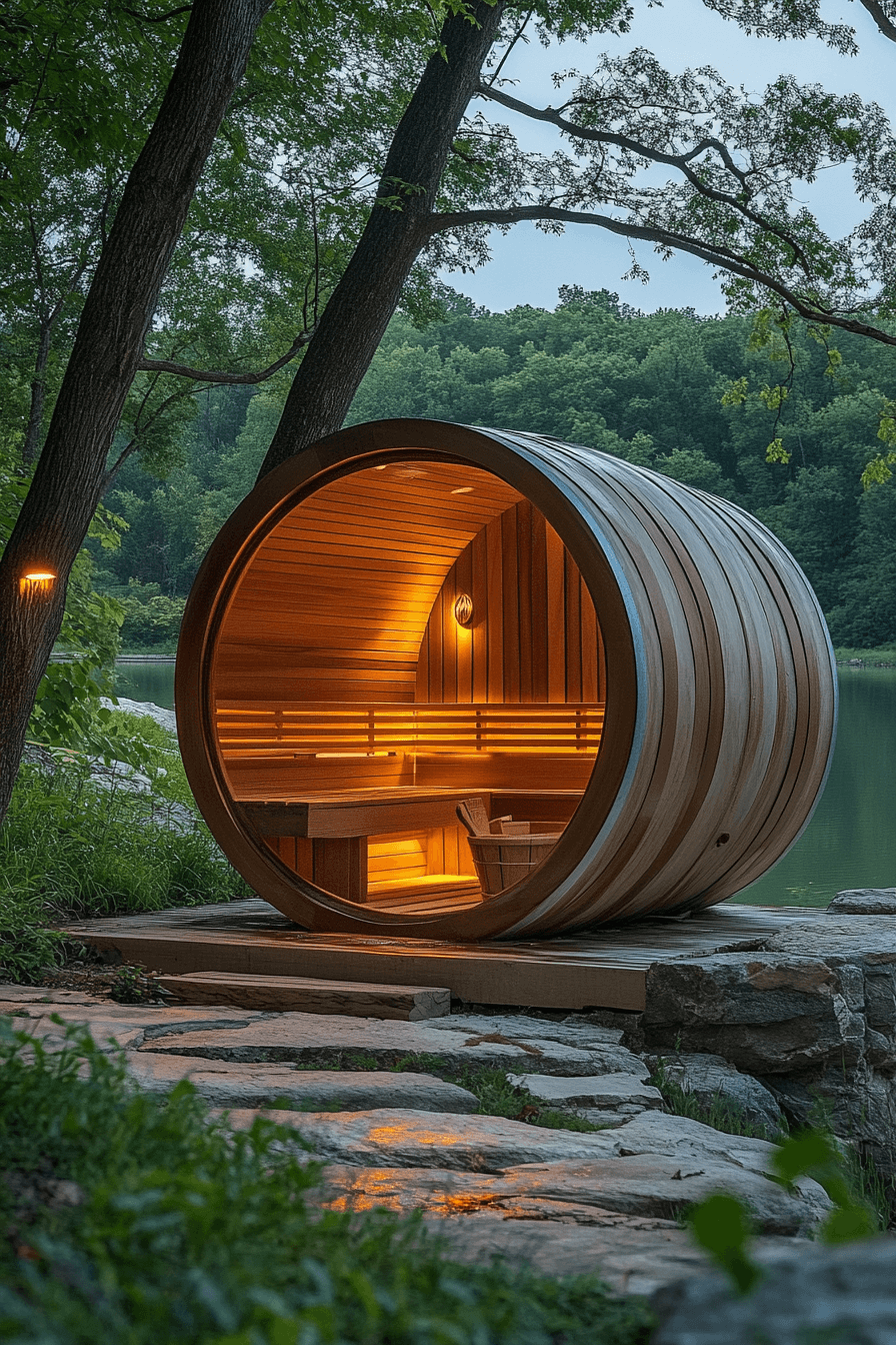 Curved forms bring charm and efficiency to outdoor sauna ideas inspired by barrel structures. The rounded shape improves heat circulation. Compact designs fit into smaller outdoor spaces. Natural wood adds warmth and durability. These sauna ideas combine practicality with style. Discover the beauty of barrel sauna design.