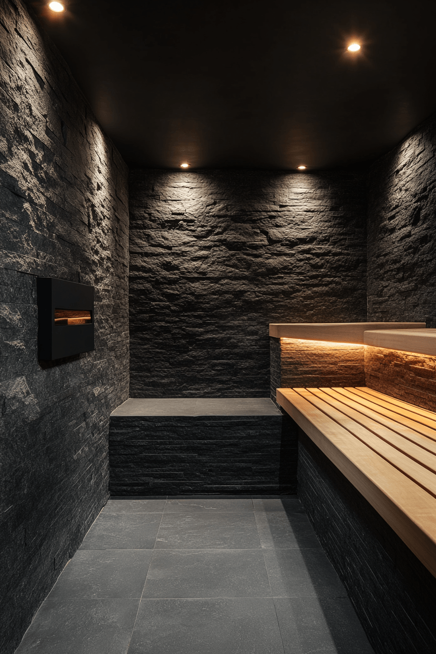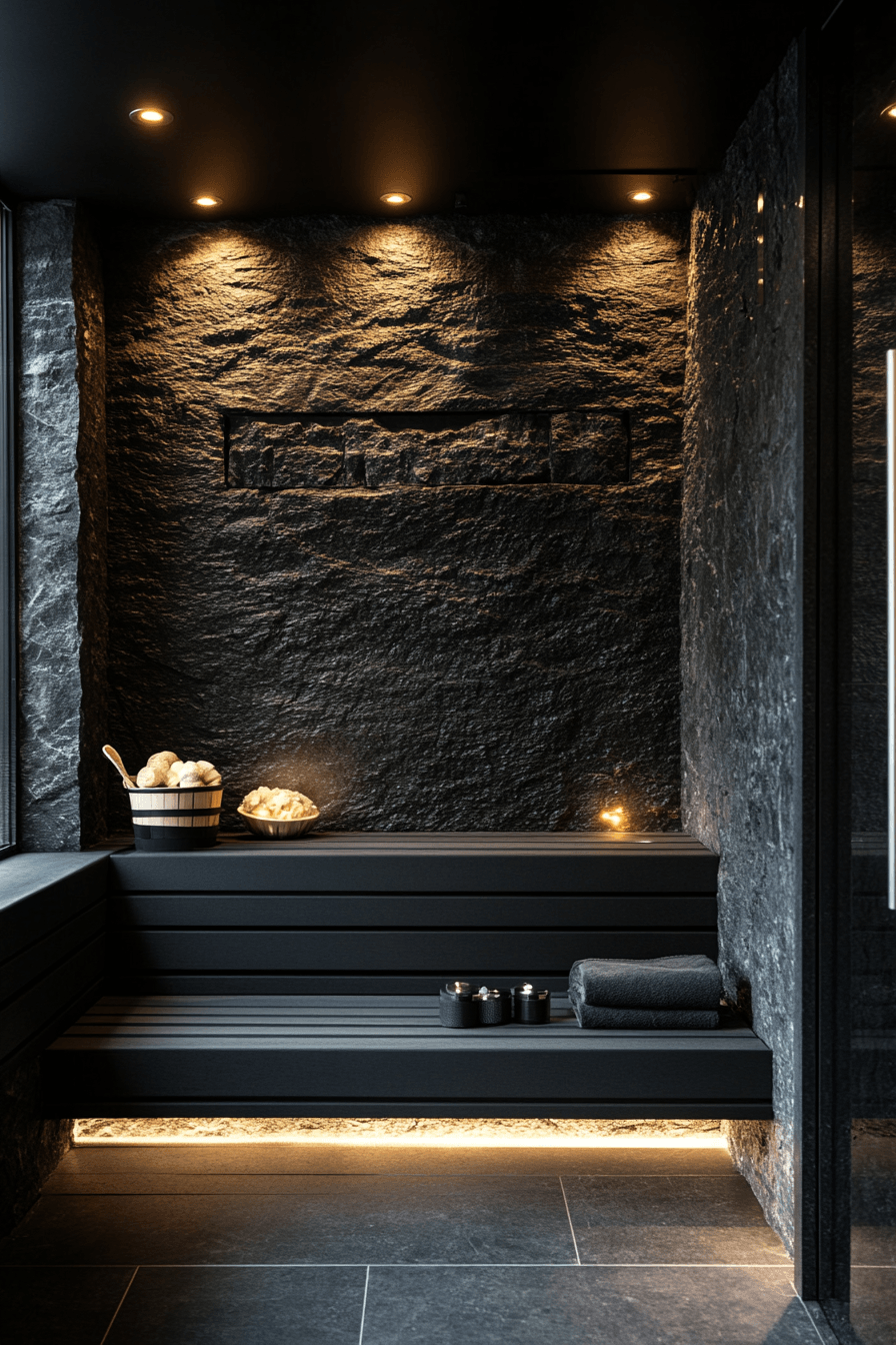 Bold design takes shape with sauna ideas featuring dark stone and dramatic finishes. Deep tones add intensity while maintaining a calming environment. Stone surfaces retain heat effectively. Soft lighting balances the bold aesthetic. These sauna ideas feel powerful yet relaxing. Discover how dark tones can redefine your sauna.