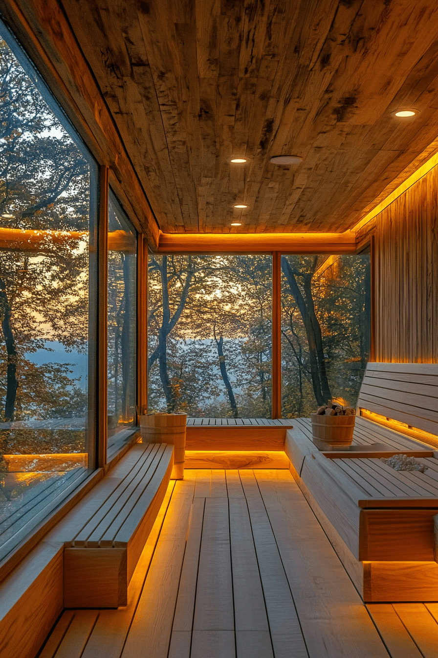 Panoramic windows transform sauna ideas into nature-connected experiences. Expansive glass frames stunning views. Natural light enhances relaxation. The space feels open and tranquil. These sauna ideas blend comfort with scenery. Experience relaxation surrounded by nature.