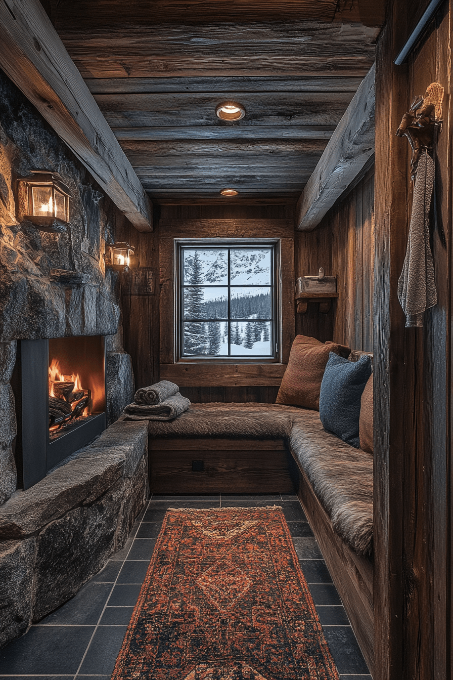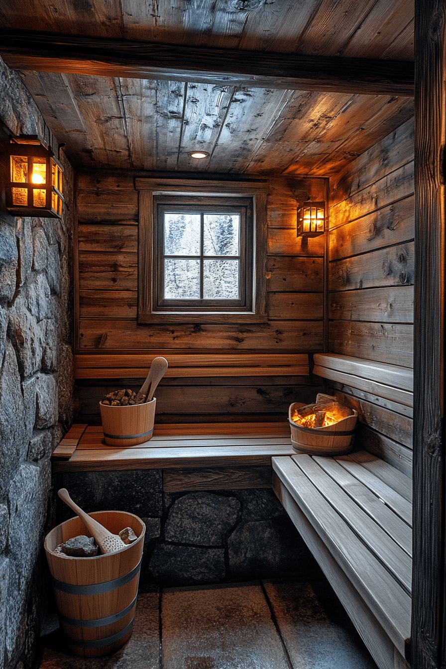 Cozy mountain-inspired sauna ideas bring the charm of alpine retreats into your home. Natural wood and stone create a warm, rustic atmosphere. Exposed beams add character and depth. Soft lighting enhances the cozy feel. These sauna ideas recreate the comfort of a cabin getaway. Step into a mountain escape anytime.