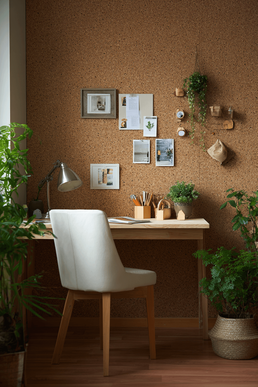 Cork surfaces add a soft, natural texture to organic modern decor while enhancing comfort and functionality. This material offers warmth both visually and physically. Its tone blends seamlessly with neutral palettes. Cork works across floors, walls, and decor accents. The space feels cozy and practical. Tap into more organic modern decor ideas using cork.