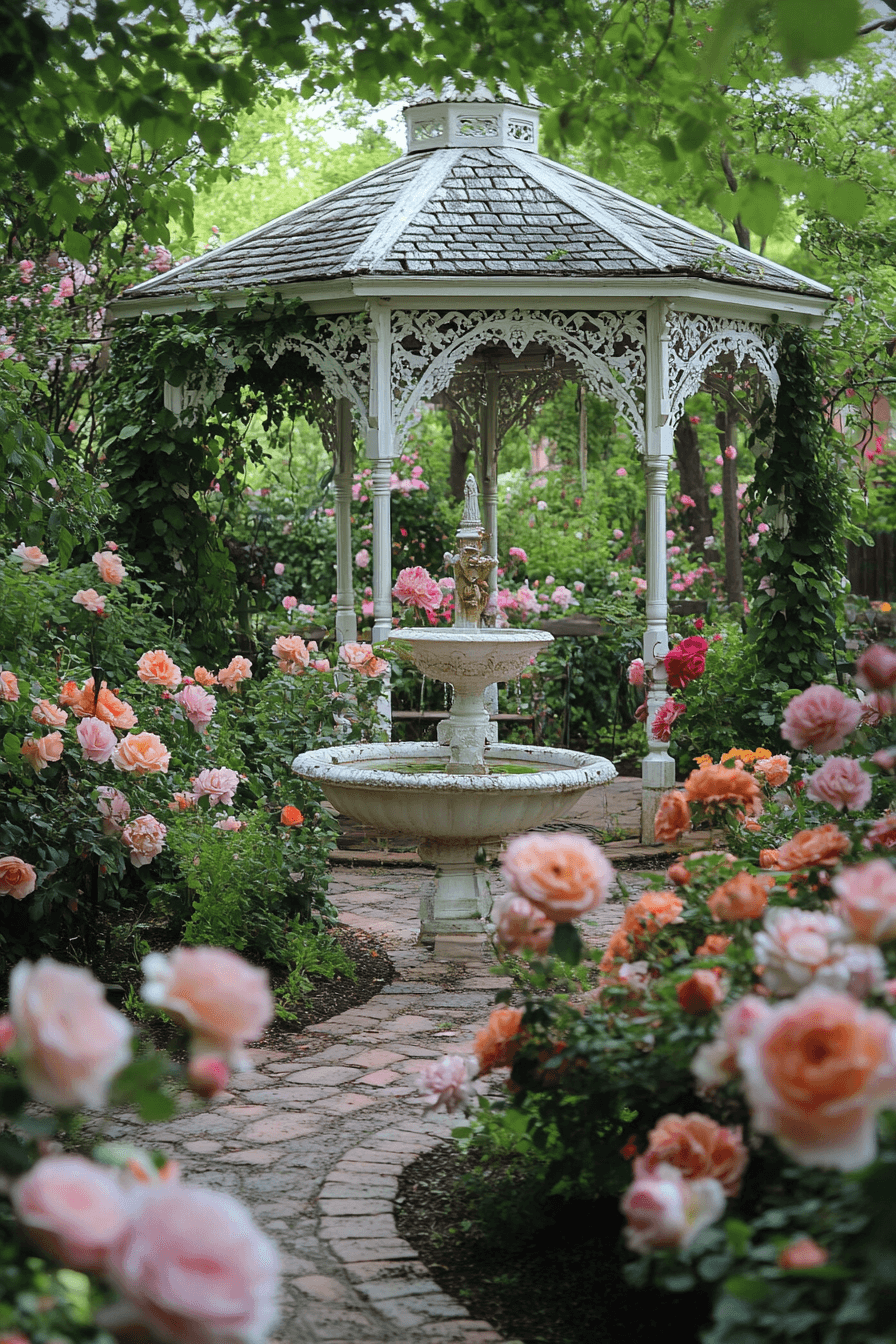 Timeless sophistication unfolds when antique yard decor ideas draw inspiration from classic Victorian gardens. Decorative iron seating, sculptural statues, and ornate gazebos establish a refined, old-world mood. Delicate blooms and climbing vines soften the space with romance. A tiered fountain introduces graceful movement and visual harmony. The garden feels elegant, nostalgic, and carefully composed.