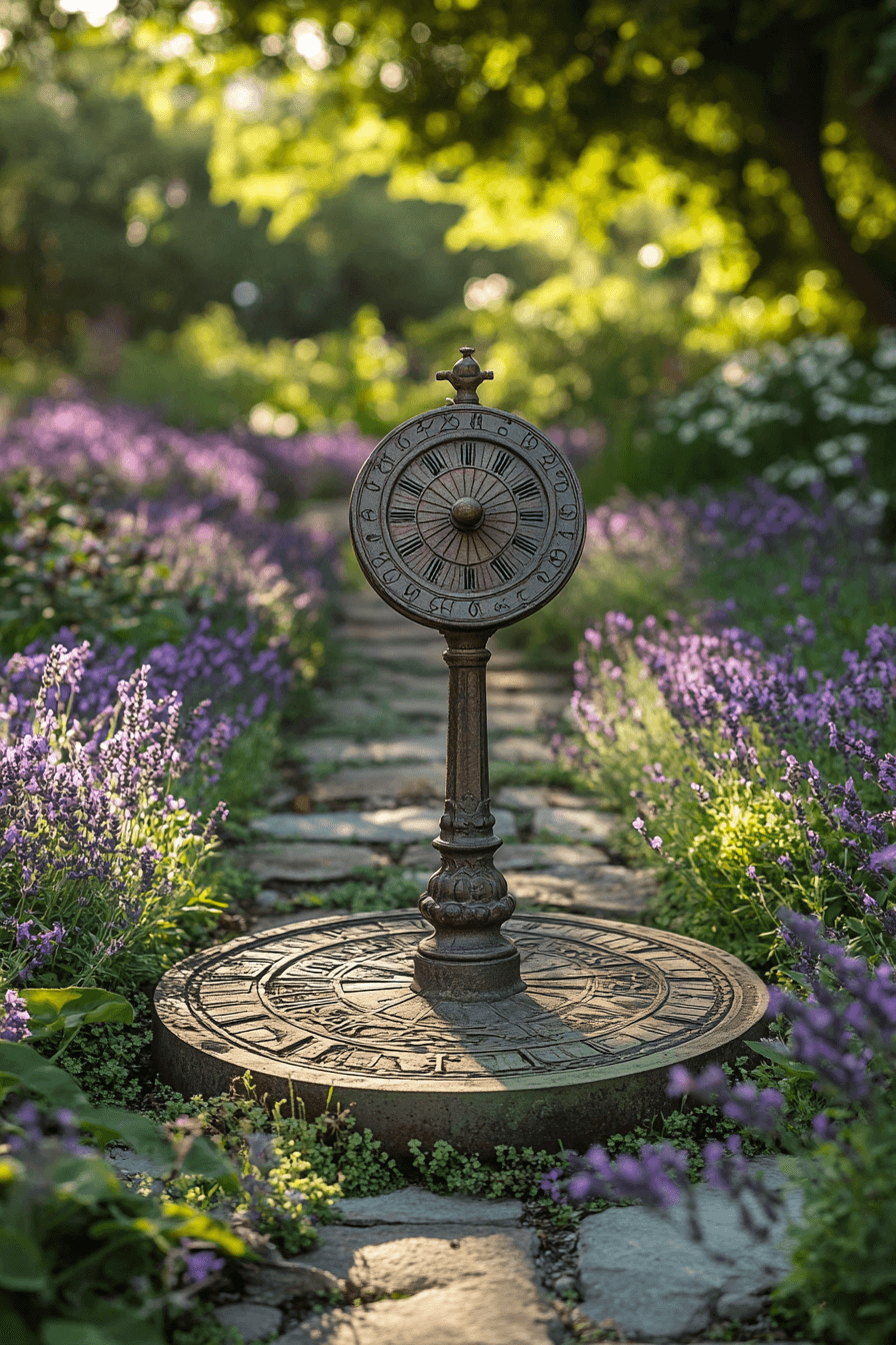 Intellectual charm meets beauty with antique yard decor ideas featuring traditional sundials. Positioned in sunlight, they offer function and elegance. Aged finishes strengthen the historical feel. Floral surroundings elevate their presence. Guests are drawn to their quiet sophistication.