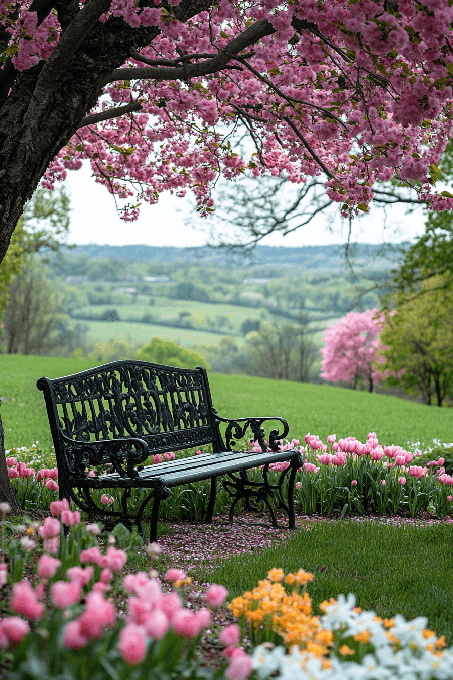 Quiet relaxation defines antique yard decor ideas centered around vintage garden benches. Iron or aged wood construction blends durability with charm. Nestled beneath trees or beside water, they invite rest. Surrounding florals complete the scene. The space encourages lingering moments outdoors.