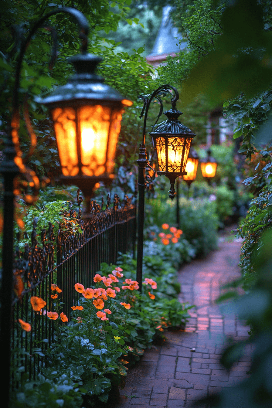 Evenings glow warmly through antique yard decor ideas featuring ornate outdoor lighting. Lantern-style fixtures cast soft, historic illumination. Placement along paths and seating areas adds safety and beauty. Light highlights textures and architectural details. Nighttime gatherings feel magical.