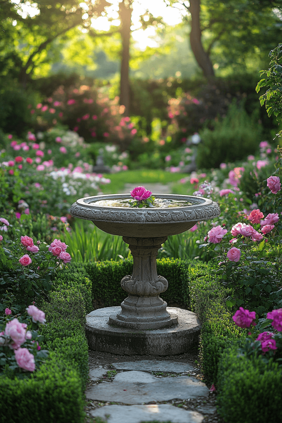Nature and artistry unite with antique yard decor ideas using decorative bird baths. Sculptural forms add elegance and visual interest. Placement invites birds and gentle movement. Floral borders enhance their charm. Beauty and function work in harmony.