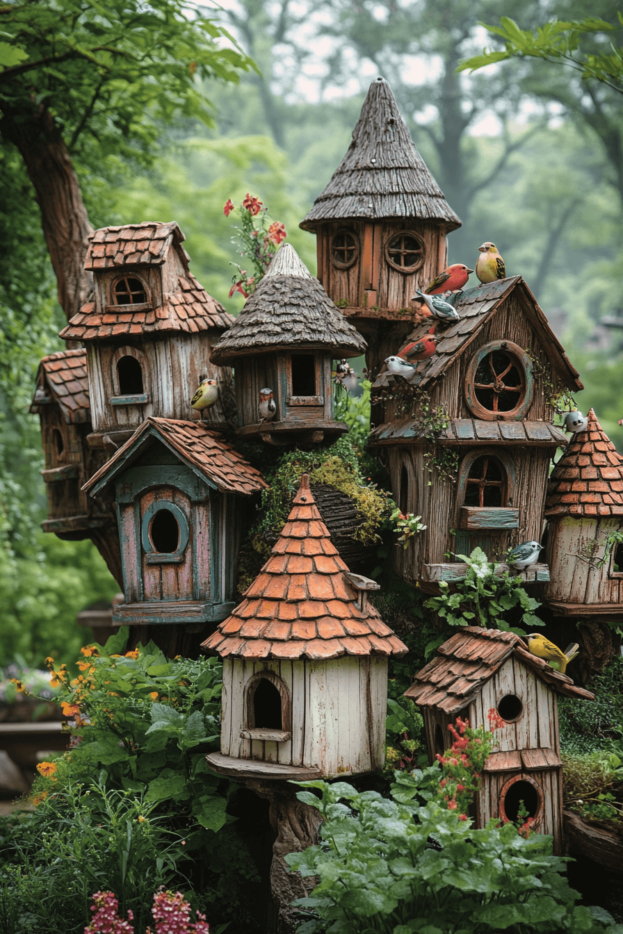 Quaint charm blossoms with antique yard decor ideas featuring English cottage birdhouses. Decorative details add whimsy among flowers. Strategic placement adds movement and life. Birds animate the garden naturally. Beauty and function unite.