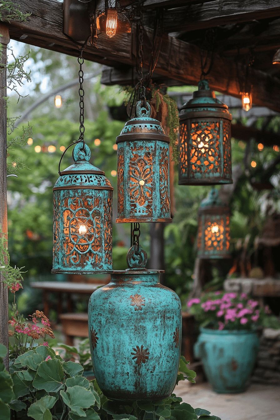 Metallic warmth enriches antique yard decor ideas through aged copper accents. Lanterns, planters, and chimes develop evolving patina. Sunlight highlights texture by day, glow by night. Copper blends beautifully with greenery. The effect feels organic and timeless.