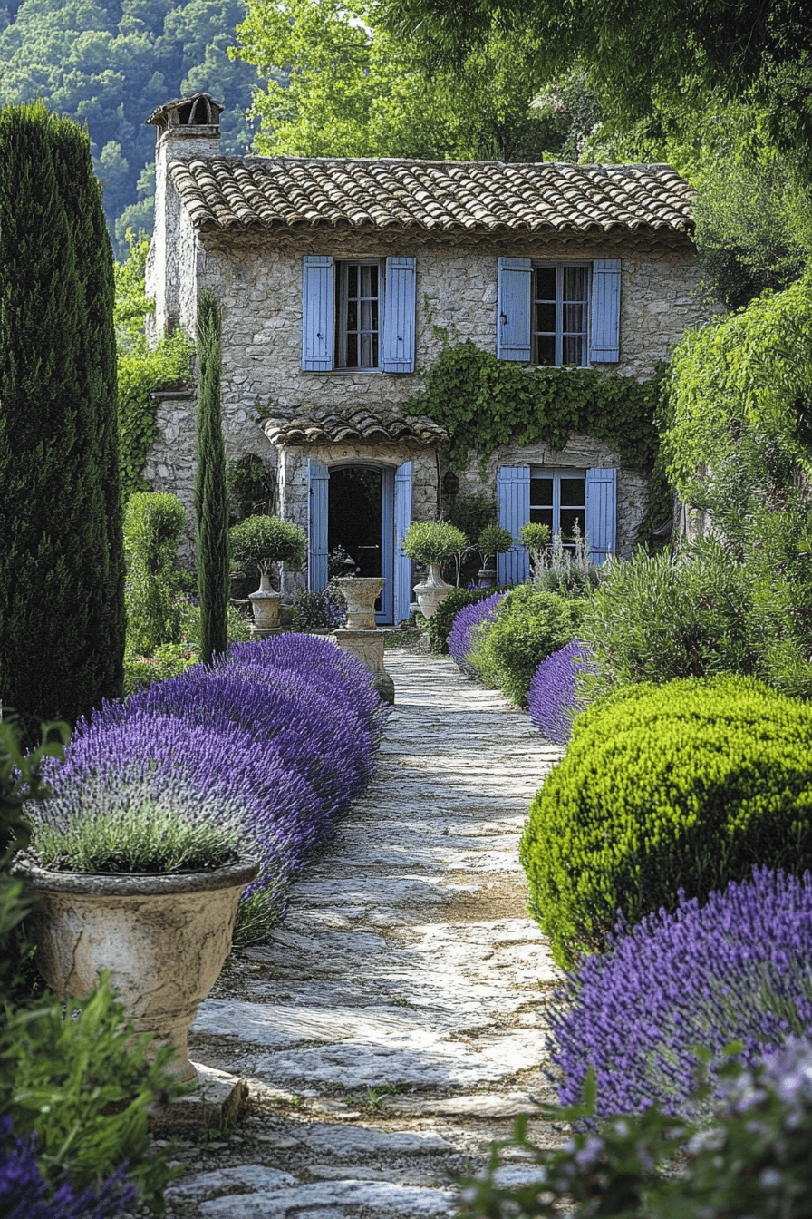 Effortless beauty defines antique yard decor ideas inspired by French countryside gardens. Curved iron furniture, soft stone accents, and terracotta containers establish relaxed elegance. Fragrant herbs lining walkways elevate the sensory experience. A weathered water feature adds calm and charm. The atmosphere feels light, romantic, and curated.