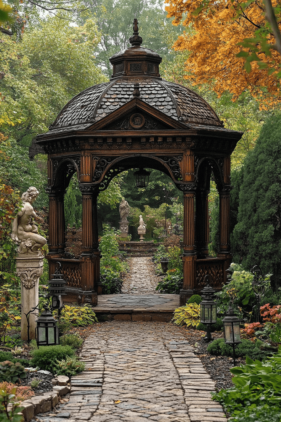 Structural elegance takes center stage with antique yard decor ideas featuring classic gazebos. Decorative craftsmanship in wood or metal reflects artistry from another era. Flowering vines soften the lines and blend the structure into nature. Vintage seating underneath invites rest and reflection. The gazebo becomes a timeless garden anchor.