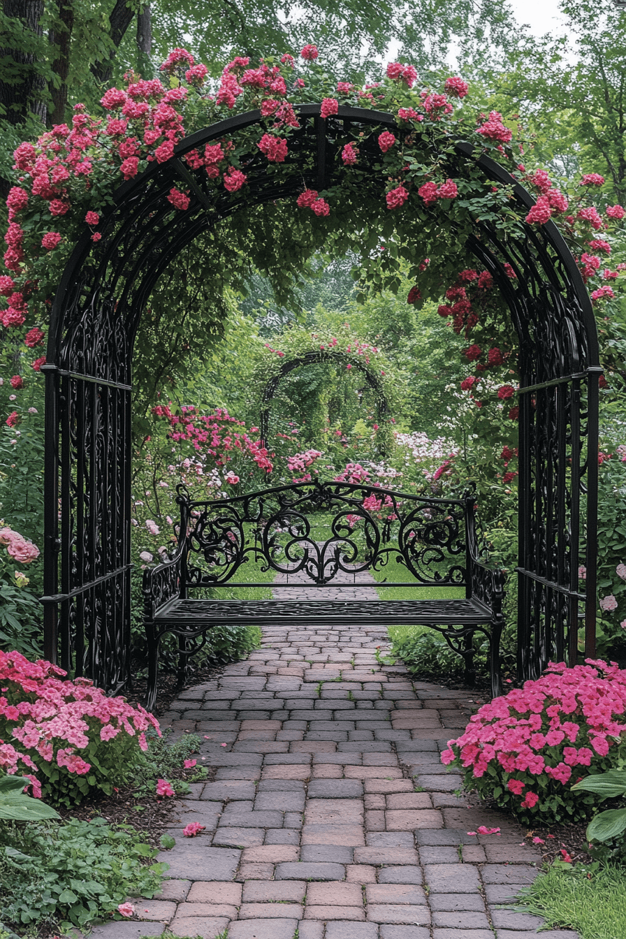 Bold lines add depth to antique yard decor ideas featuring arched garden structures. Dramatic silhouettes define transitions between spaces. Climbing plants soften their grandeur. Stone accents deepen historical charm. The garden feels layered and dynamic.