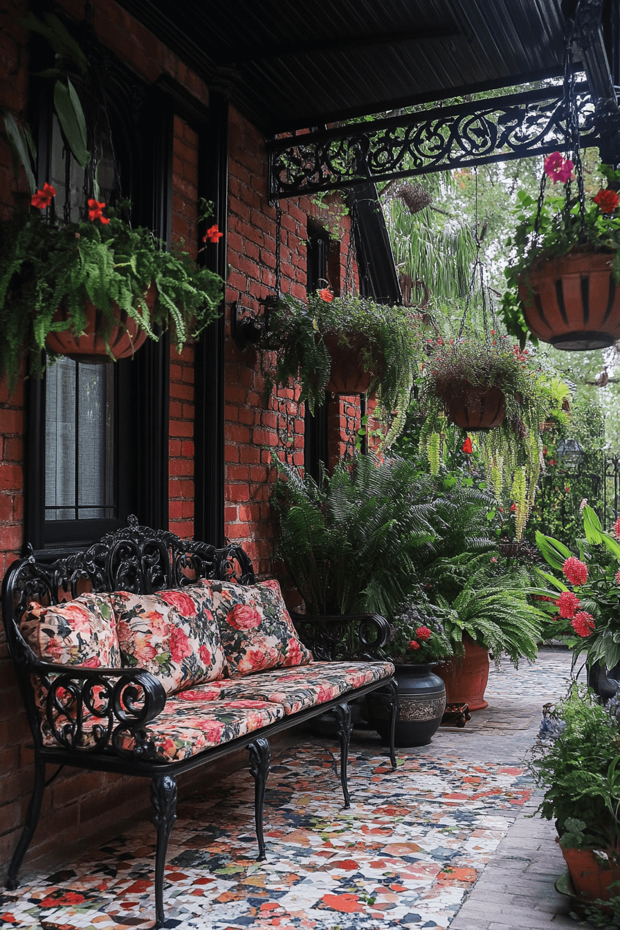 Layered greenery transforms spaces through antique yard decor ideas inspired by Edwardian terraces. Ferns and palms add softness and depth. Wicker seating paired with floral cushions brings timeless comfort. Decorative tile tables introduce subtle artistry. The terrace feels serene and refined.