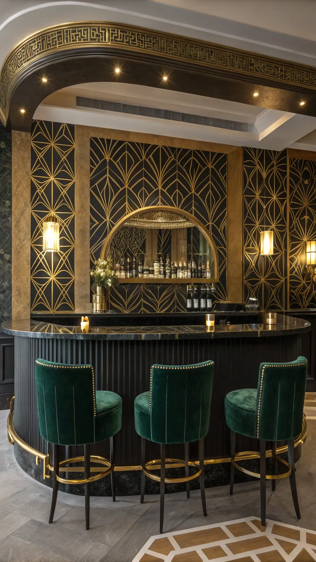"Elegant modern basement bar with matte black quartz counter, illuminated glass shelves, brushed brass lights, and charcoal brick accent wall"