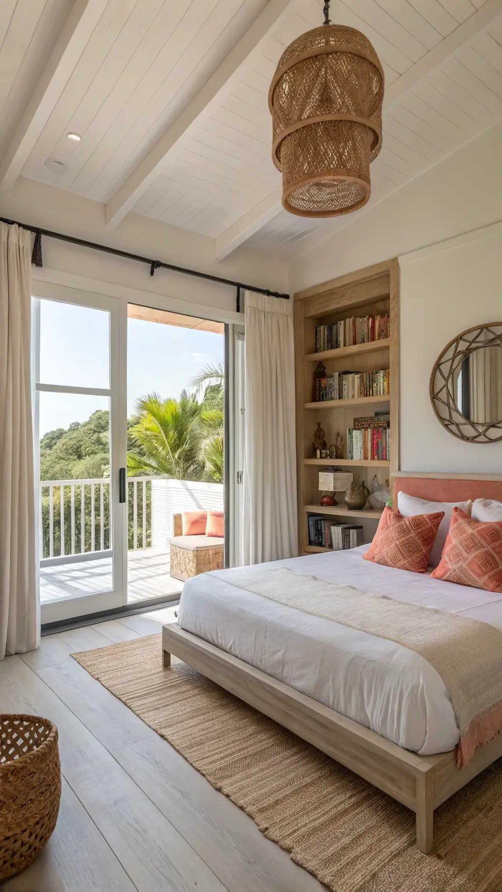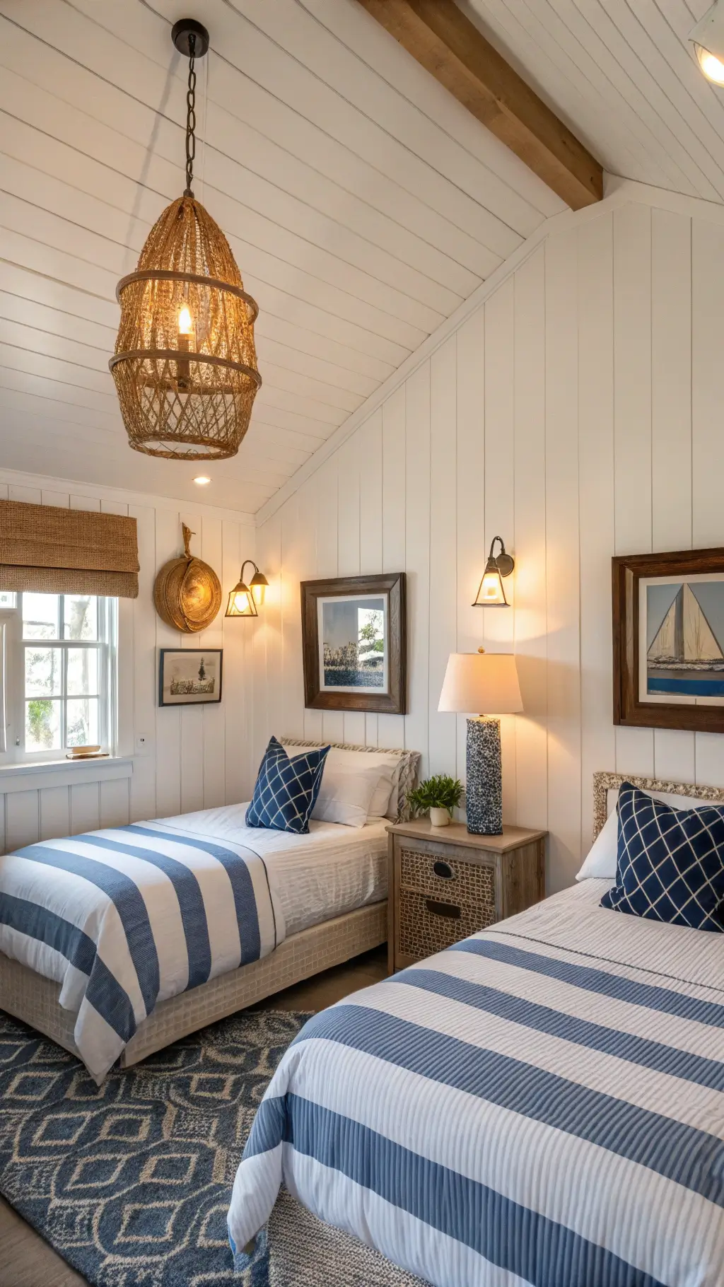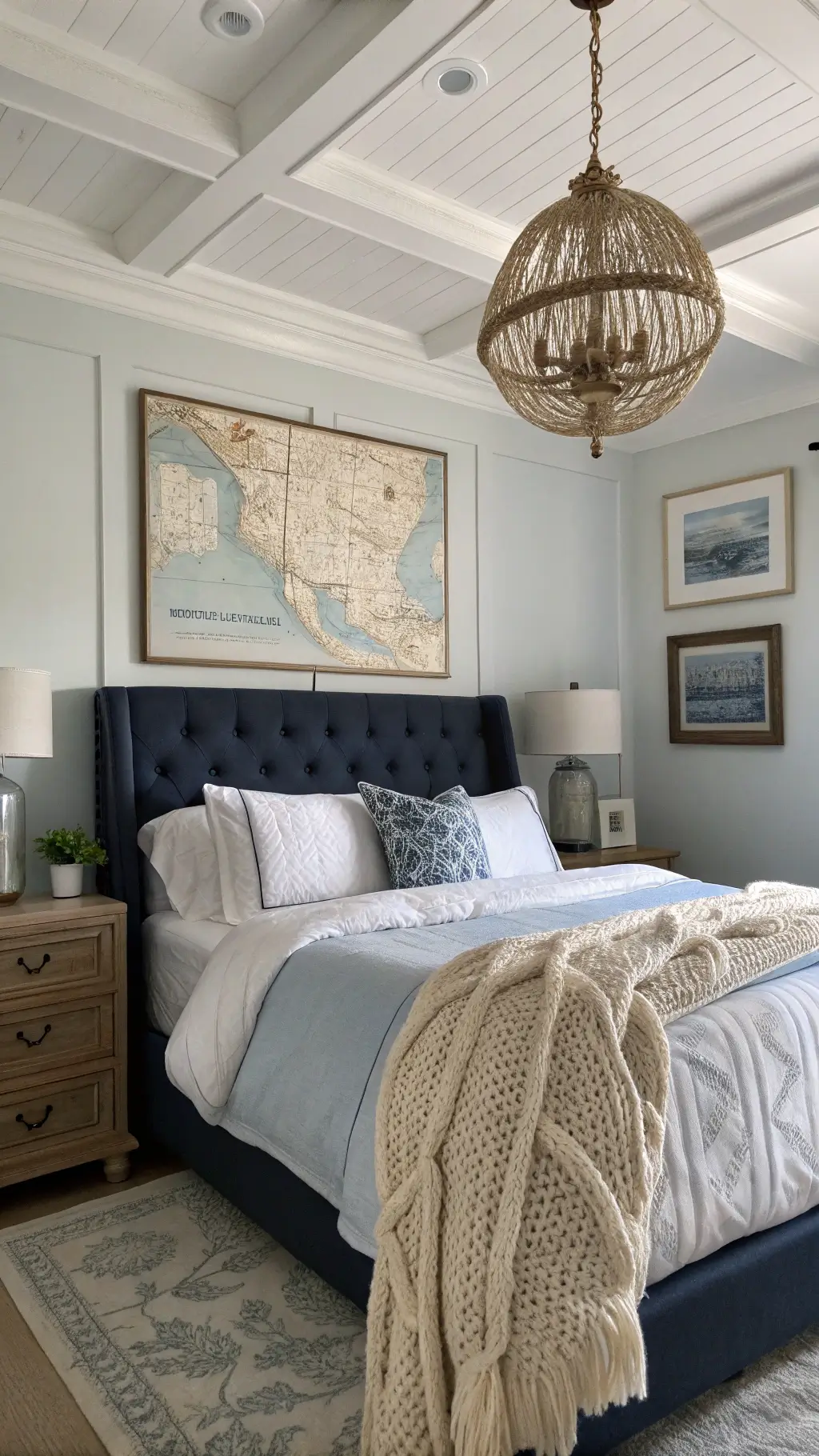 "Coastal bedroom with a king-sized bed, rattan headboard, and maritime-themed décor bathed in soft sunlight"
