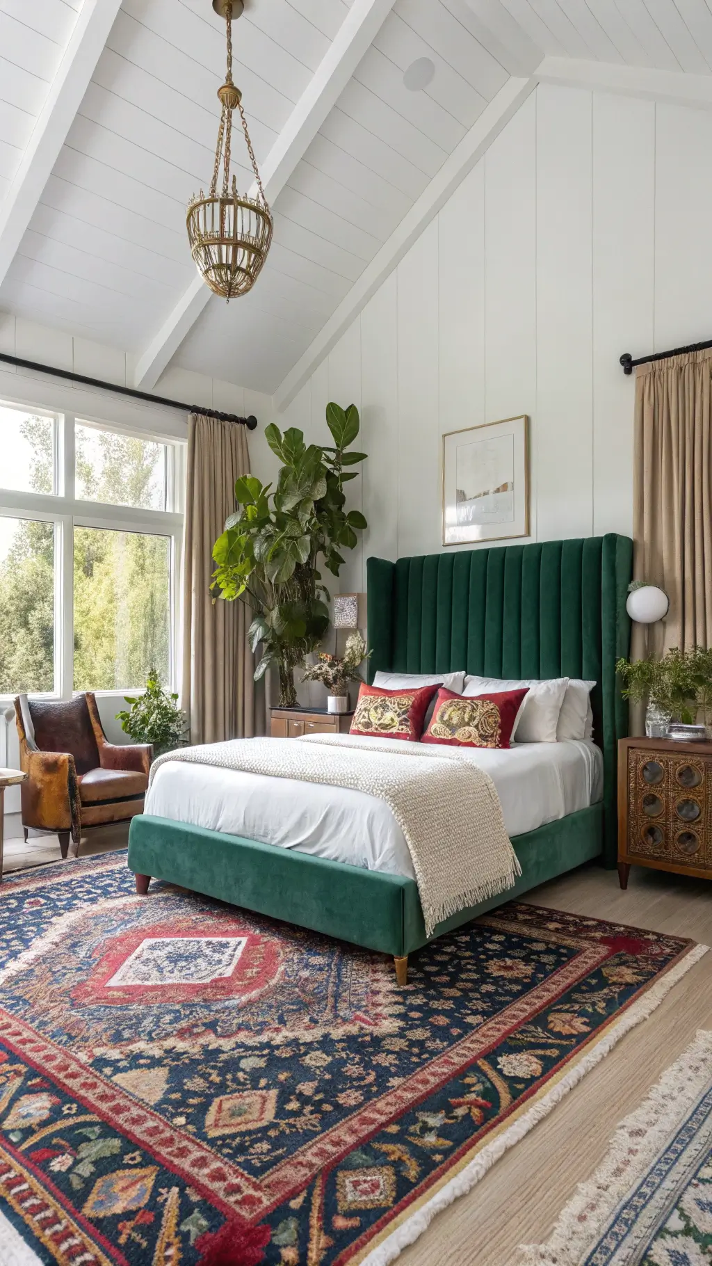 "Boho bedroom with earthy jewel tones featuring layered textiles, weathered leather headboard, vintage Persian rug, macramé wall art, rattan lamp, velvet accent chair, and plant décor in a sunlit setting."