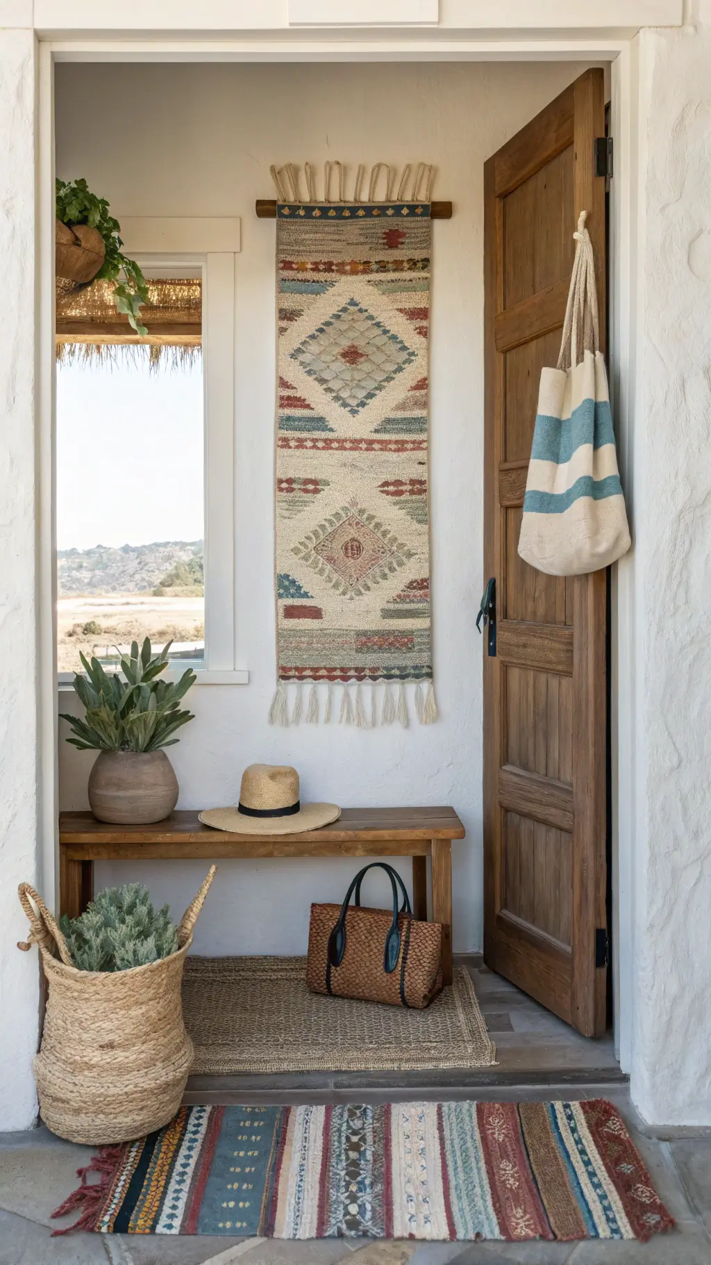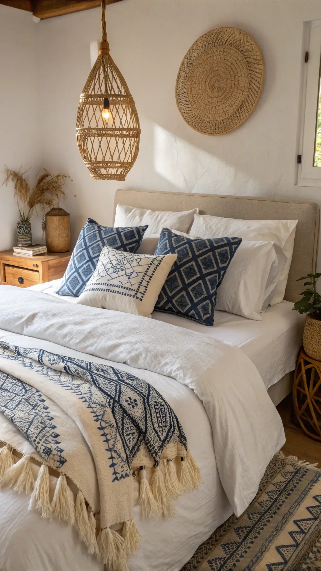 - Rattan or wicker headboard – The ultimate boho coastal statement