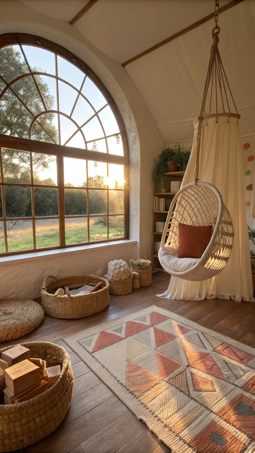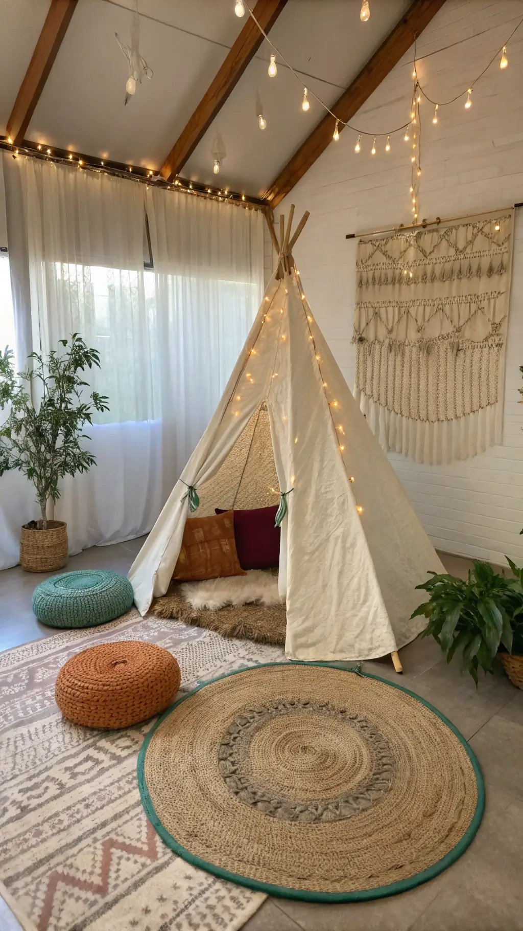 "Boho style kids' playroom with rattan furniture, macrame decorations, and a sunlit teepee"