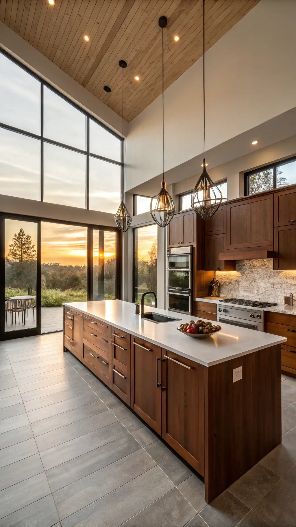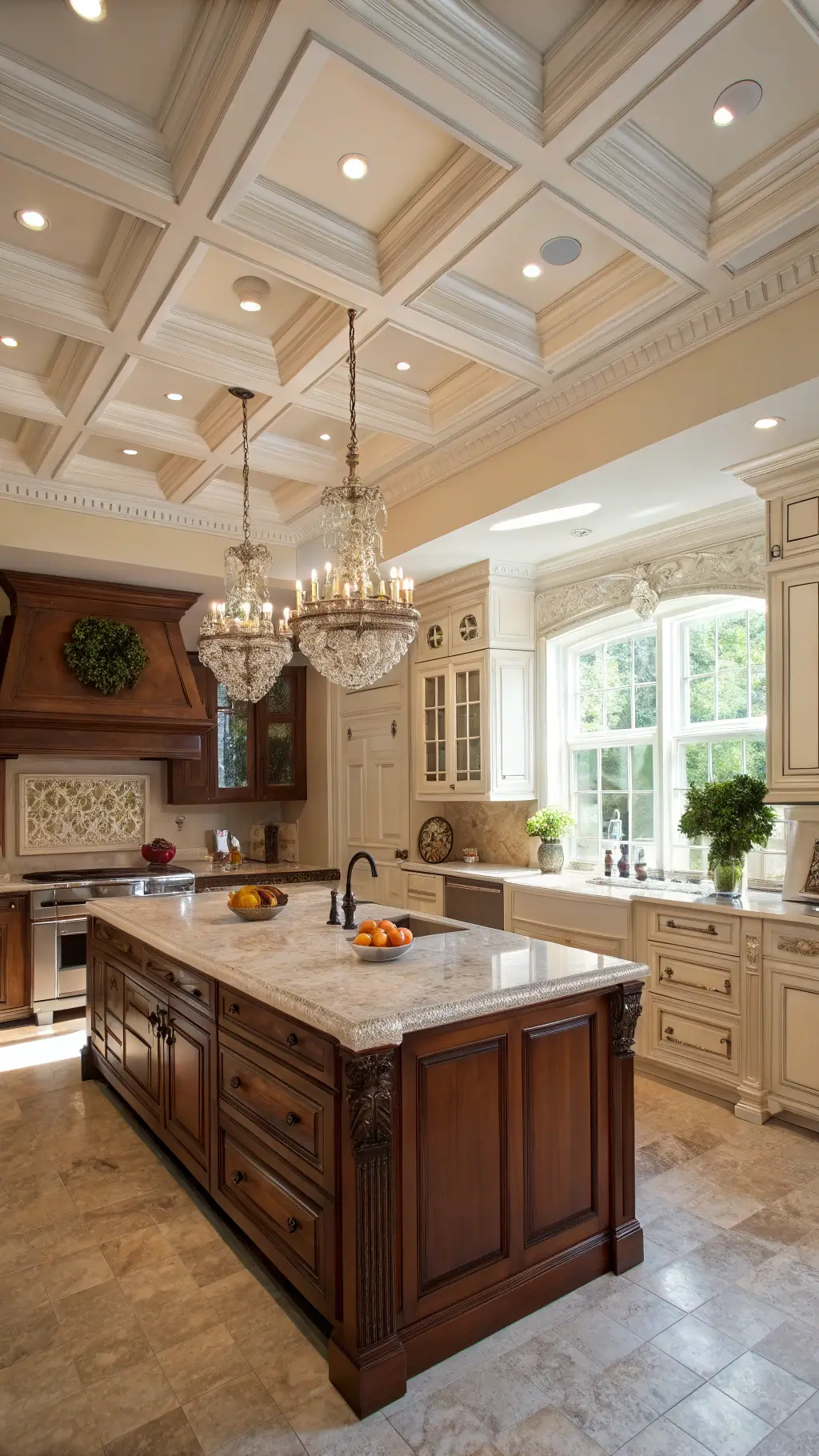 "Luxurious cherry wood kitchen with marble islands, professional appliances, crystal chandeliers, and herringbone floors at golden hour"