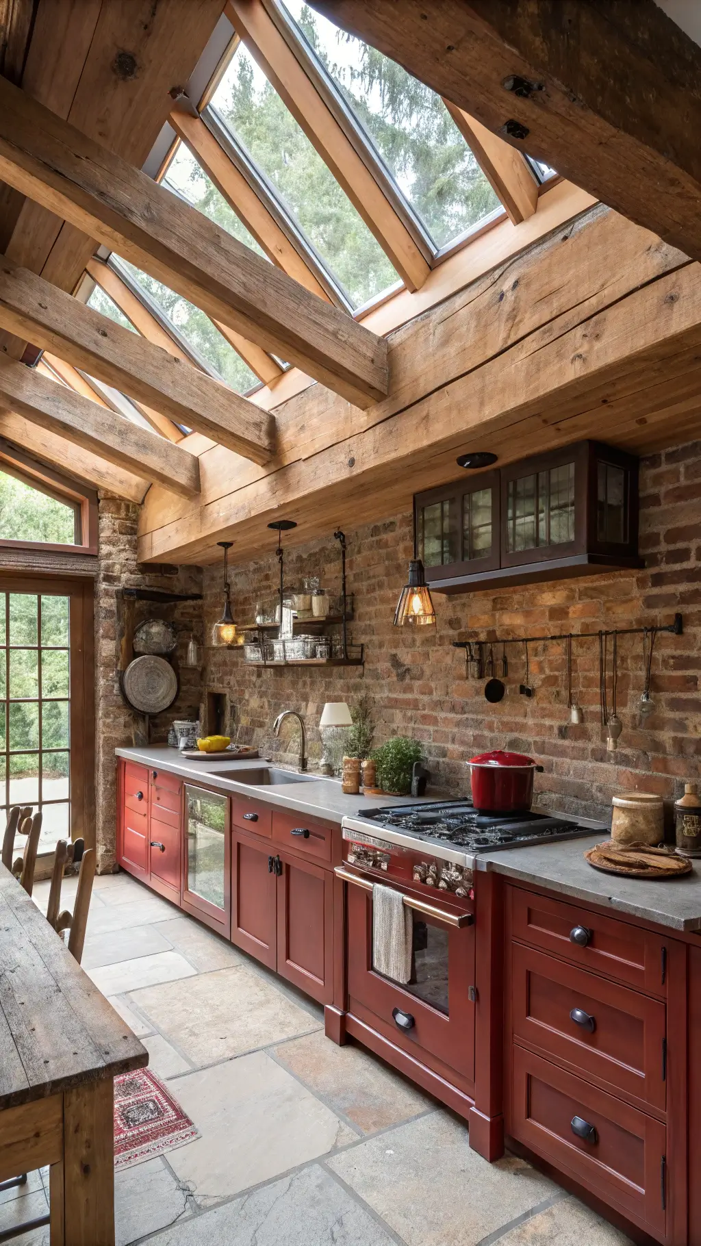 Warm autumnal 16x20ft kitchen with exposed wooden beams, cherry cabinets with copper hardware, a large farmhouse sink, fall produce, copper vessels and textured linens enhanced by soft directional golden hour lighting.