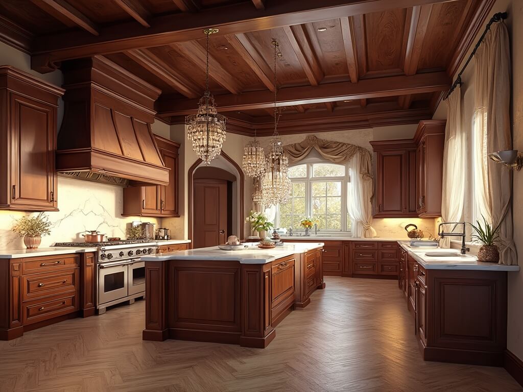 "Luxurious cherry wood kitchen with marble islands, professional appliances, crystal chandeliers, and herringbone floors at golden hour"