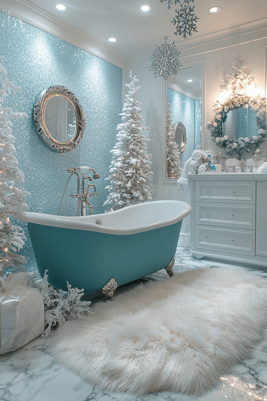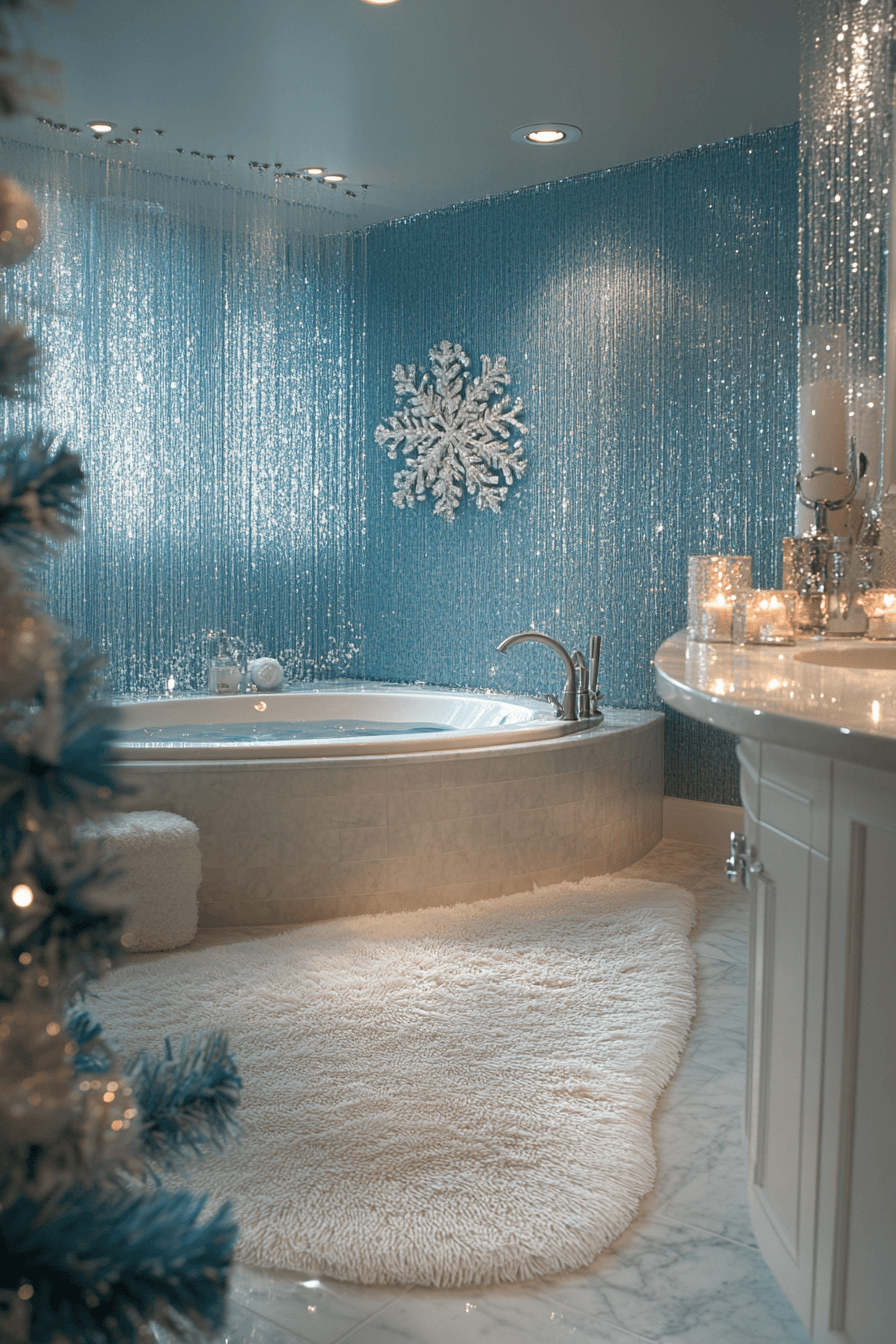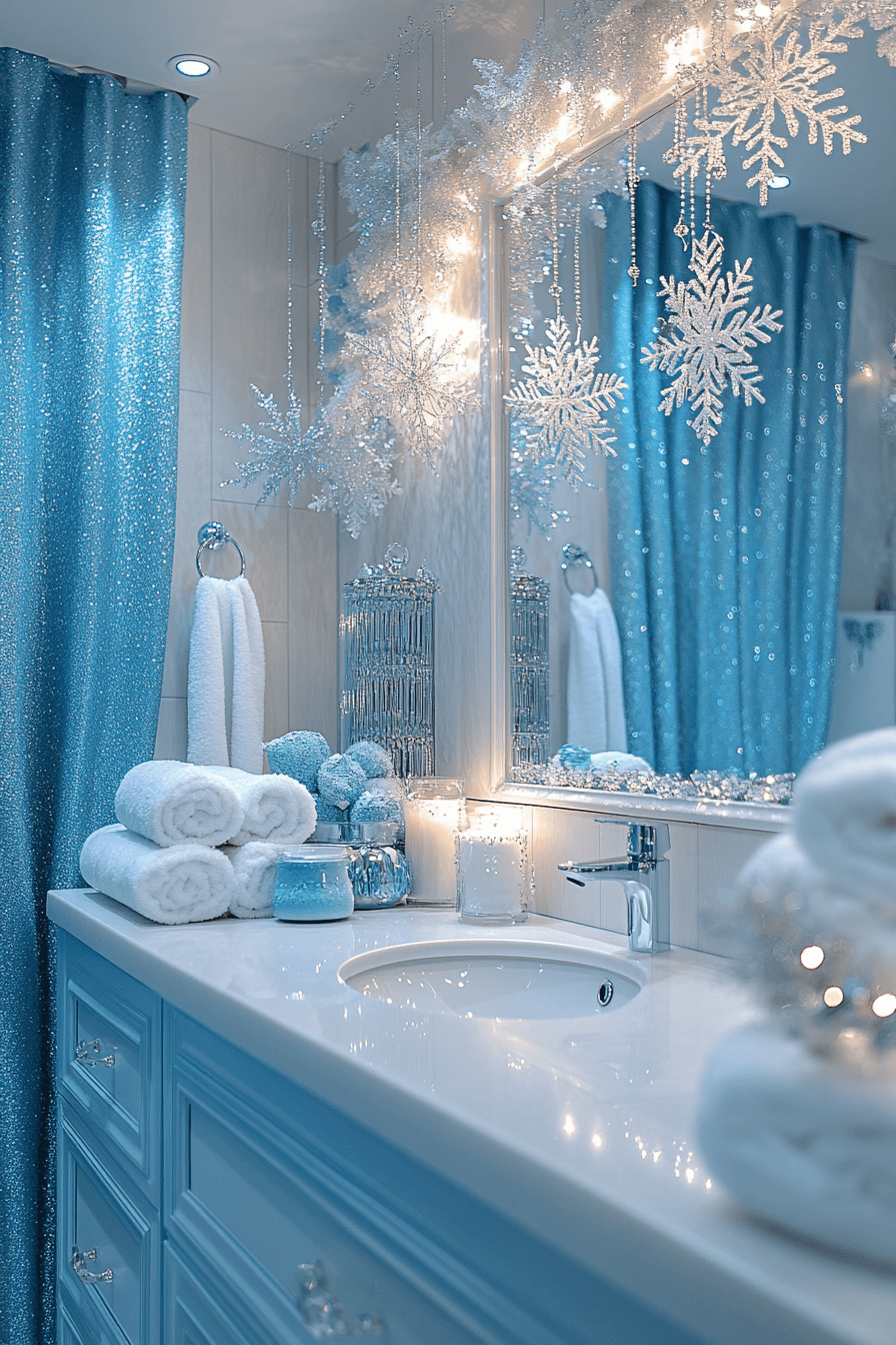 Step into your own snowy spa with christmas bathroom decor that glows in frosty blues and dazzling silver. Sequined towels and mirrored jars reflect twinkle lights like glistening snowflakes. Clear accessories and soft white rugs complete the dreamy winter vibe. It’s a peaceful, polished look perfect for lovers of winter elegance.