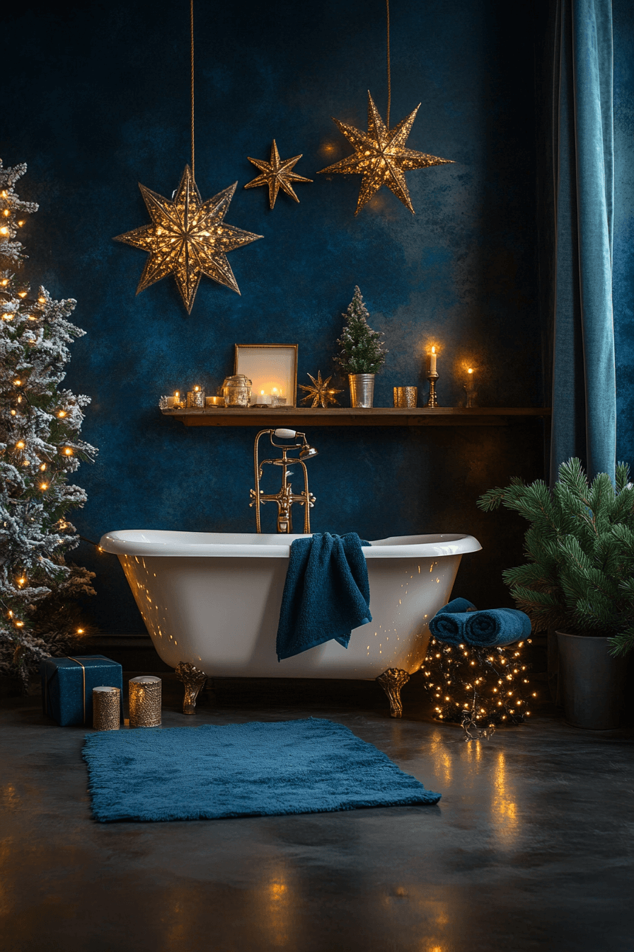 Create a calming, luxurious retreat with christmas bathroom decor that channels Christmas Eve’s quiet elegance. Think silver sparkle, navy tones, and velvet details that mirror a silent night. This peaceful palette feels indulgent and serene. It’s holiday sophistication at its finest.