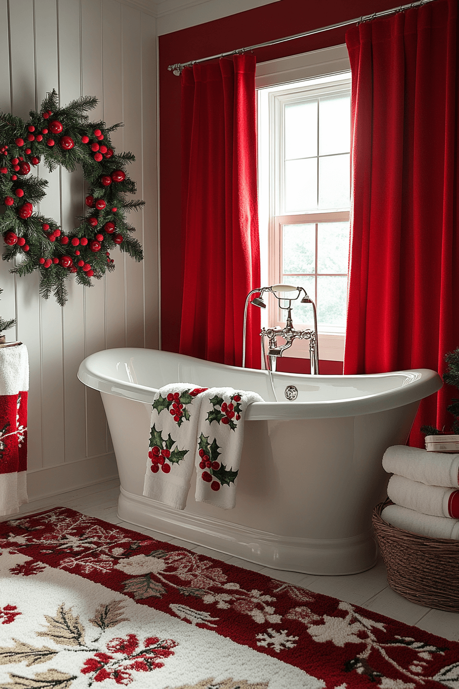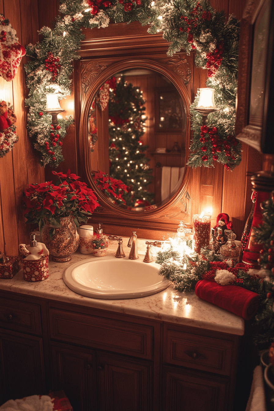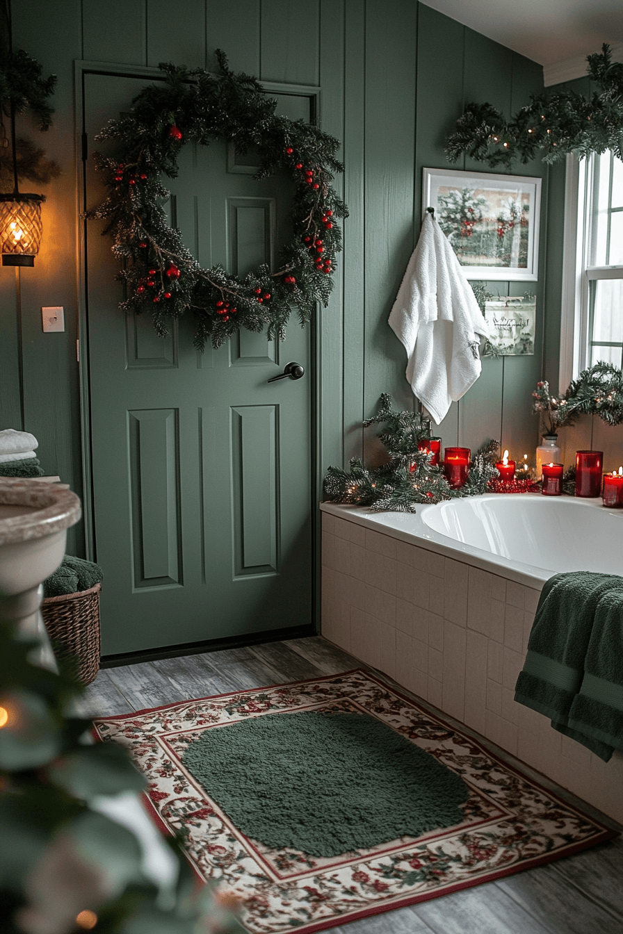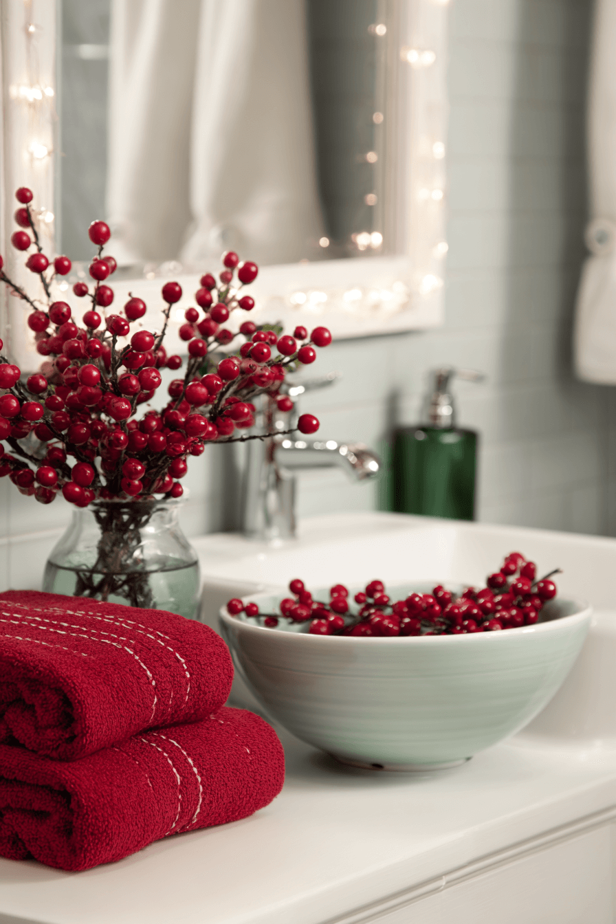 Give your bathroom a fresh and festive makeover with berry-inspired christmas bathroom decor. Bright red wreaths and green towels make the room feel alive with seasonal color. Add natural touches for an extra layer of warmth. This look is vibrant, cheerful, and nature-inspired.