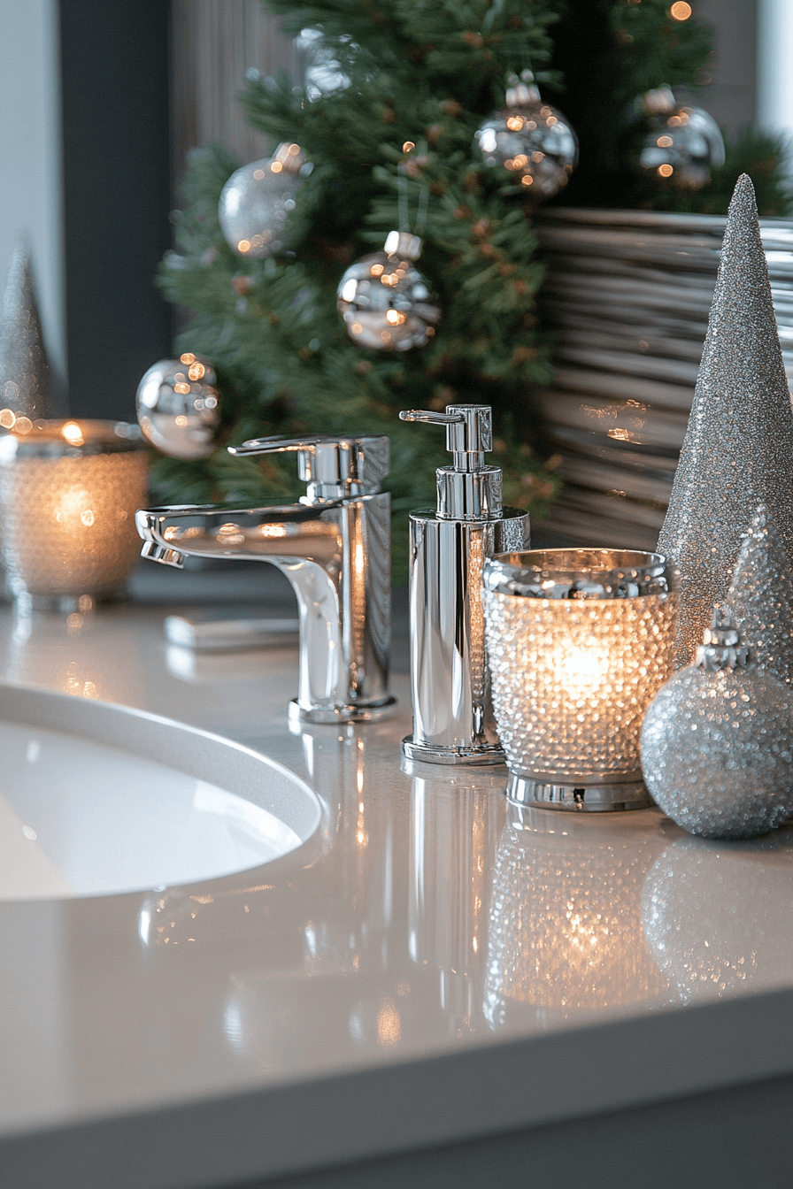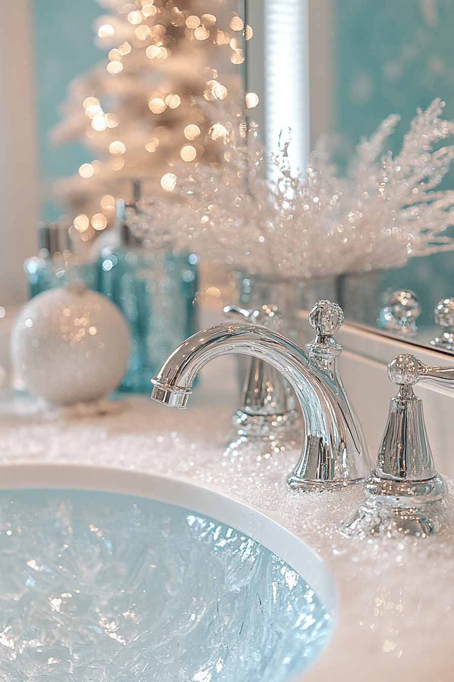 Turn your space into a sparkling retreat with christmas bathroom decor that’s inspired by icy glamour. Frosted accessories and silver finishes offer a sleek, snowy shimmer throughout the room. Think glittery accents, clear glass touches, and snowy textures. This modern look is perfect for fans of chic winter sparkle.