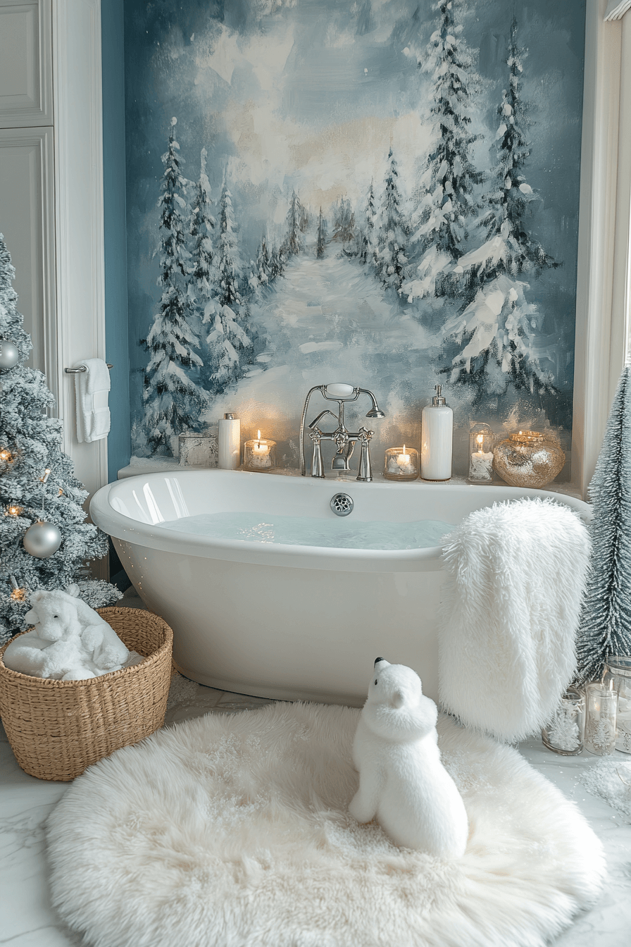 Step into a dreamy holiday escape with christmas bathroom decor that channels a winter wonderland. Use snowy white textures, silver sparkle, and icy blue accents to create a peaceful retreat. Add faux fur rugs and delicate details for that extra cozy magic. It’s elegant, ethereal, and oh-so-inviting.