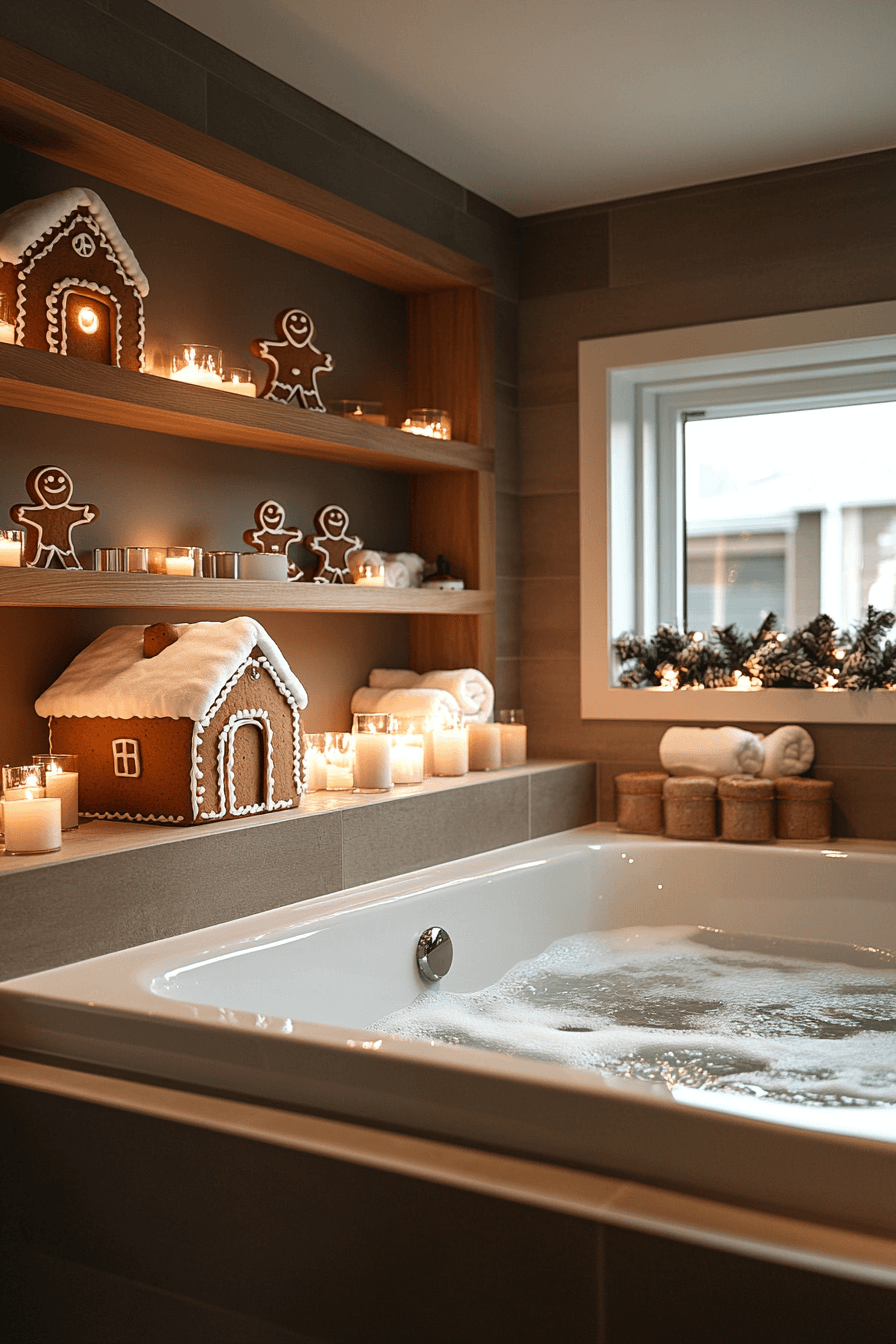 Cozy up your space with gingerbread-themed christmas bathroom decor full of sweetness and spice. Brown and cream tones, cookie-inspired accessories, and warm candlelight create a festive glow. The result is heartwarming, homey, and downright delicious. It’s like stepping into a holiday bakery.