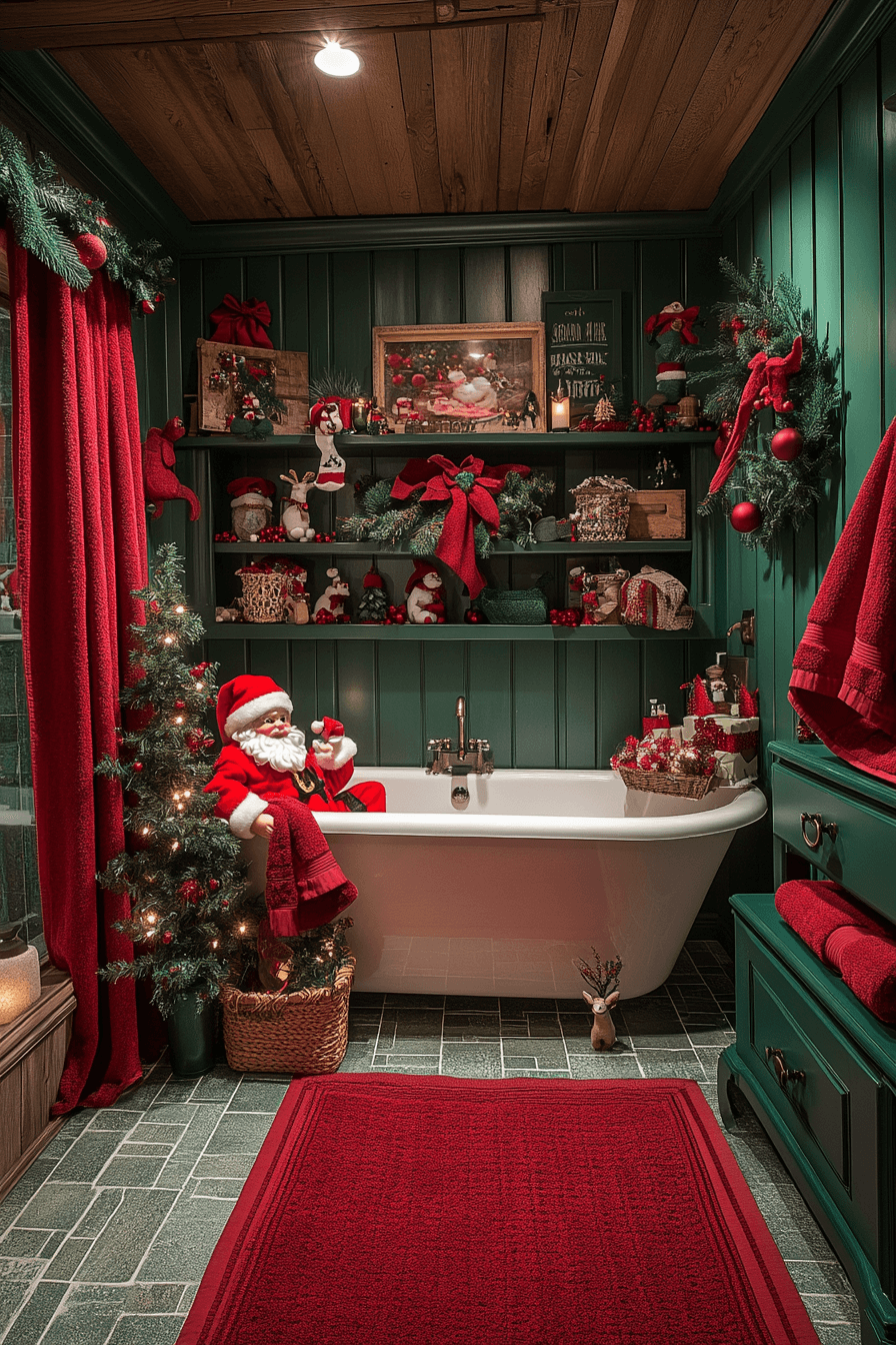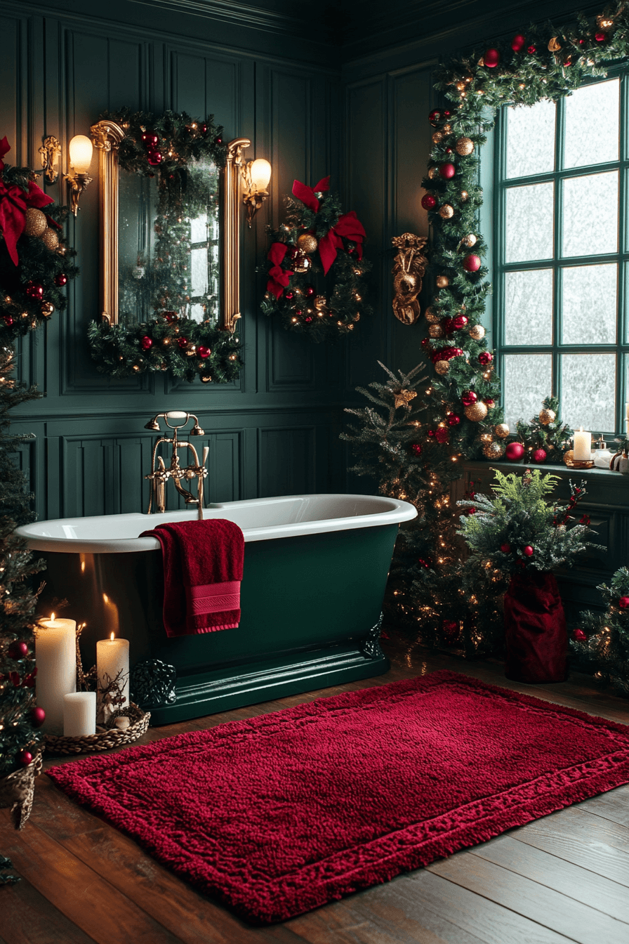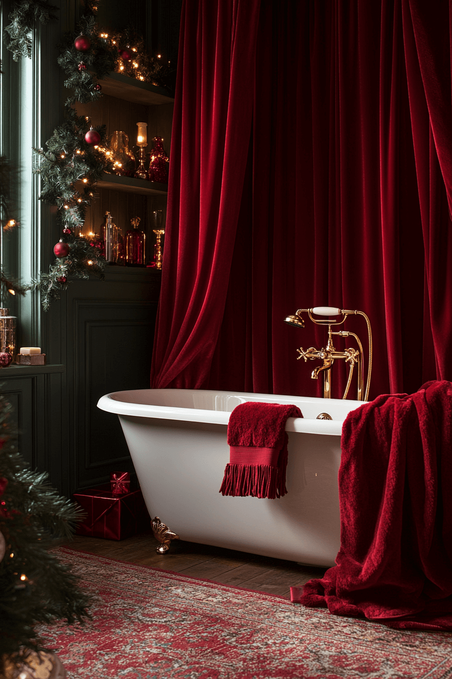 Indulge in glam with red velvet and gold-themed christmas bathroom decor that feels extra luxurious. Think velvet curtains, shiny gold hardware, and deep red accents everywhere you look. It’s a bold, regal look that elevates everyday moments. Perfect for anyone who loves a dramatic holiday vibe.