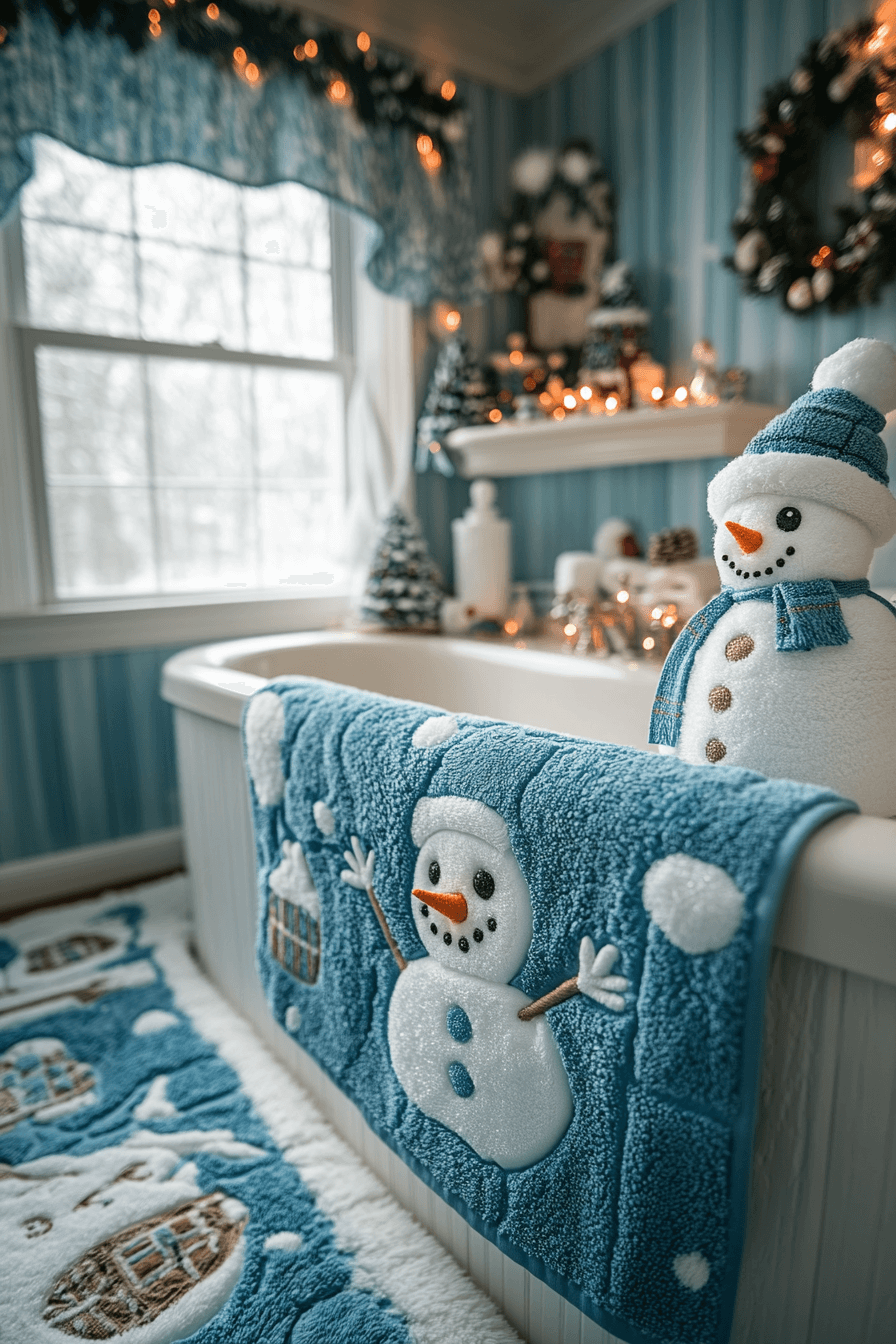 Make your bathroom merry with snowman-themed christmas bathroom decor that’s bursting with winter charm. White towels, snowflake accents, and smiling snowman figures add fun from floor to ceiling. It’s playful, bright, and endlessly cozy. A perfect pick for families and guests alike.