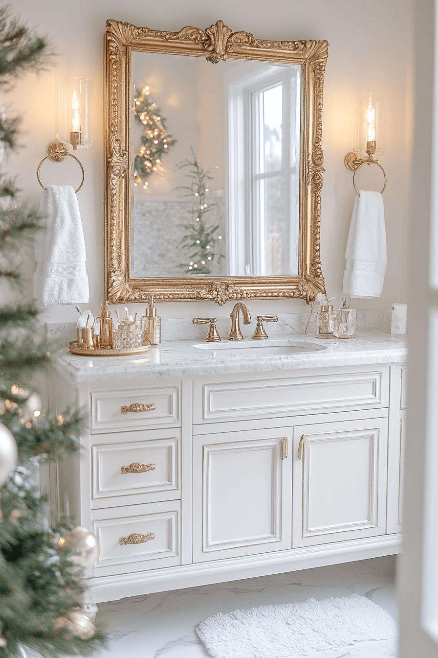 Let your bathroom glow in gold with shimmering accents and clean lines that feel effortlessly chic. Pair white elements with warm metallics for a sophisticated holiday look. This kind of christmas bathroom decor exudes polish and celebration. It’s festive but still feels fresh and modern.