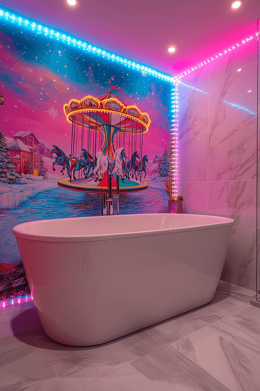 Bring cheerful energy to your space with carousel-themed christmas bathroom decor in bright, nostalgic hues. Think colorful lights, fun figurines, and joyful prints for a whimsical holiday setup. It’s a bold look with vintage flair that’s sure to stand out. Perfect for lovers of playful seasonal decor.