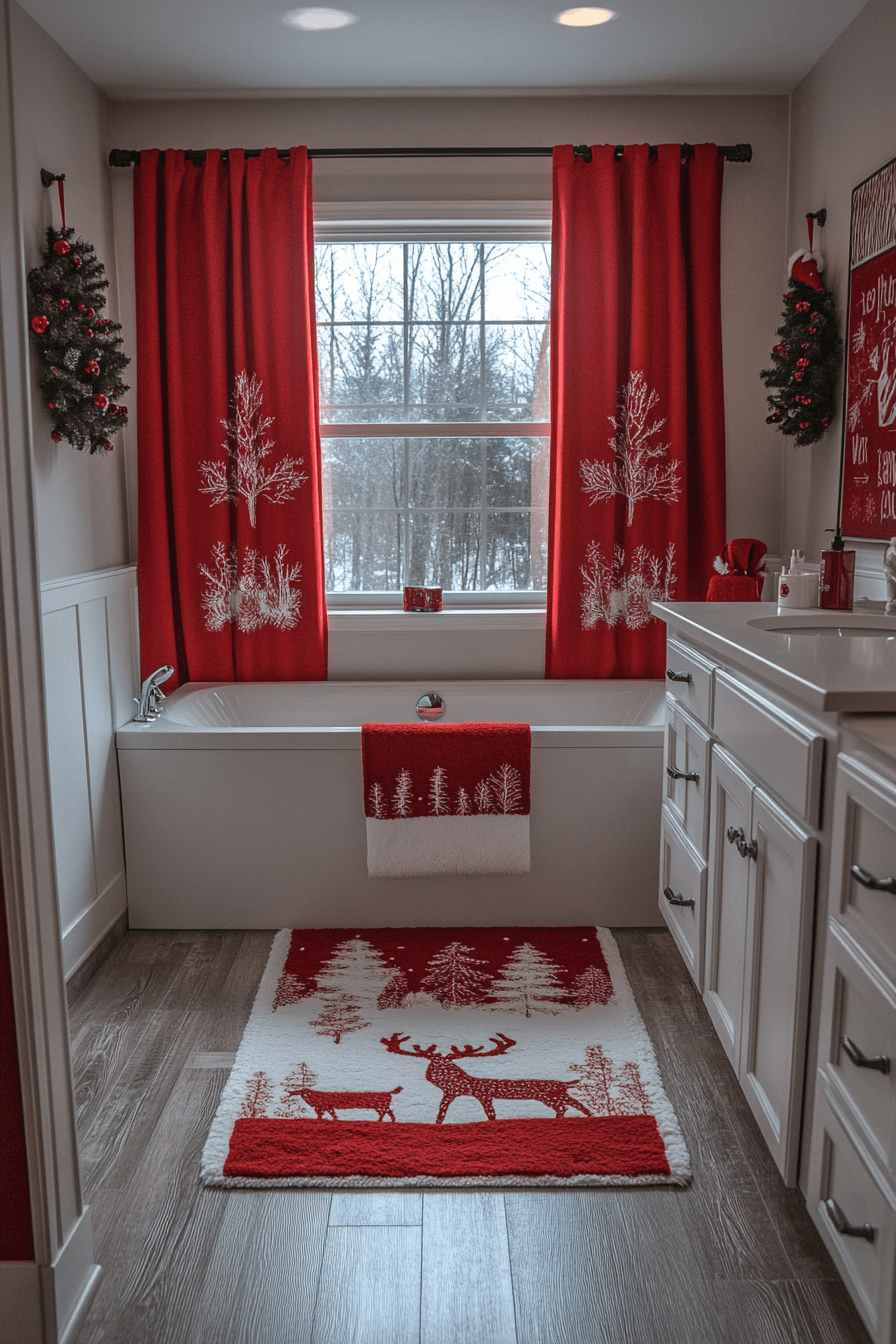 Go all in on red and reindeer with christmas bathroom decor that’s bright, cheerful, and straight out of Rudolph’s story. Add red shower curtains, themed rugs, and festive reindeer accents to complete the look. It’s fun, family-friendly, and full of holiday personality. A guaranteed crowd-pleaser.