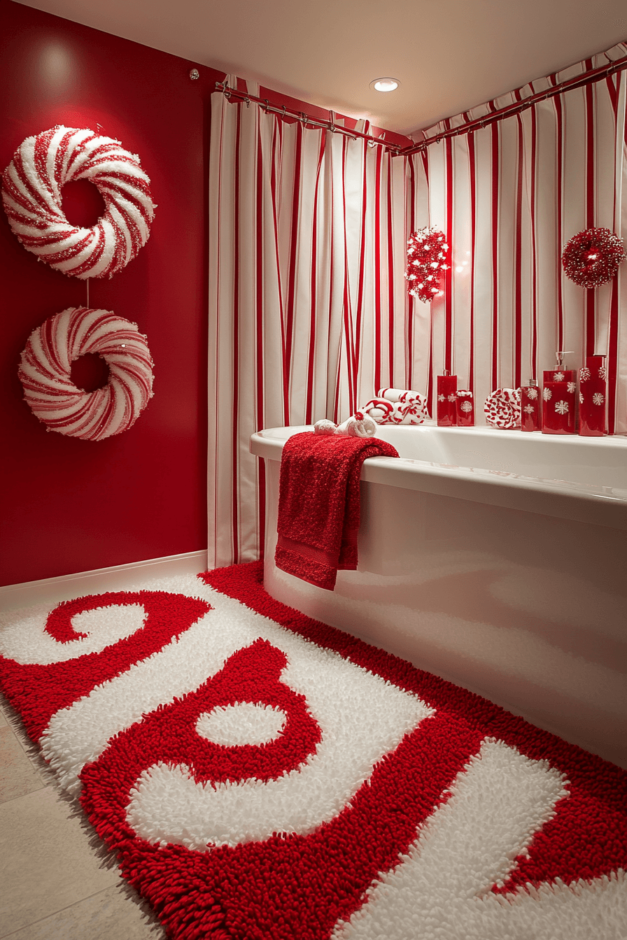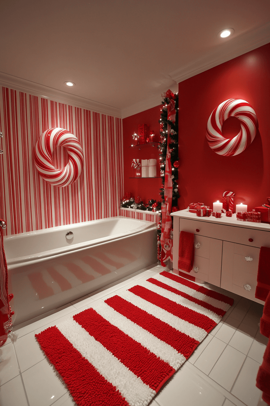 Add a festive burst of energy to your morning routine with candy cane-themed christmas bathroom decor. Bold red-and-white accents bring holiday happiness from the shower curtain to the soap tray. Every corner becomes a sweet celebration of the season. This fun setup is a treat for the whole family.