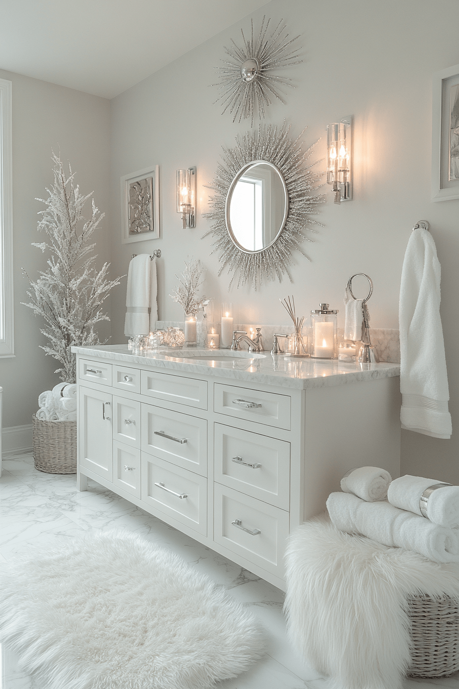 Elevate your space with christmas bathroom decor featuring crisp white linens and shimmering silver accents. Pearlescent accessories and soft textures lend a quiet luxury to your holiday vibe. It’s a clean, refined look that whispers festive sophistication. Perfect for those who adore elegance without going overboard.
