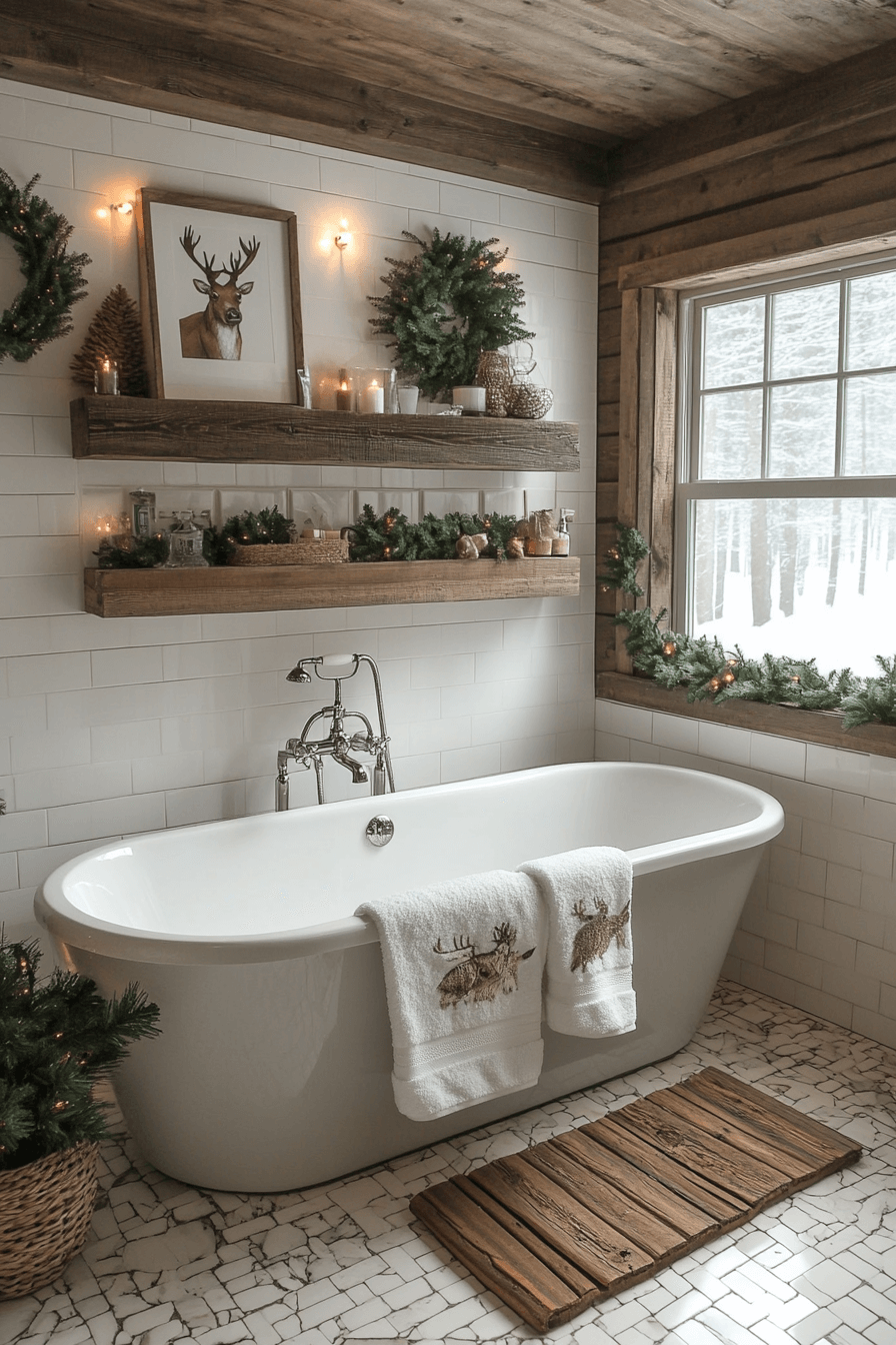 Bring rustic joy to your bath with christmas bathroom decor that embraces reindeer charm. Natural tones, cozy textures, and antler motifs give the room a cabin-like ambiance. Wood details and soft brown accents add that snug, winter-in-the-woods feeling. It’s a warm, woodsy retreat right in your home.
