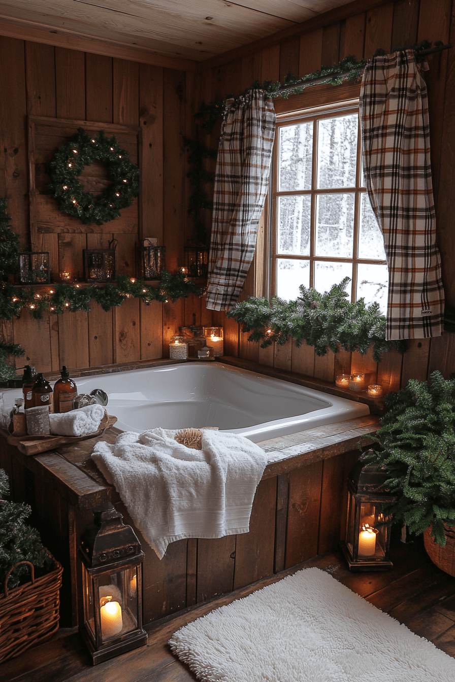 Wrap your bathroom in cabin comfort with christmas bathroom decor that channels a snowy lodge. Add flannel patterns, flickering candles, and cozy lighting to create that mountain retreat aesthetic. Rustic wall art and natural textures make the space feel intimate and festive. It’s your personal holiday hideaway.