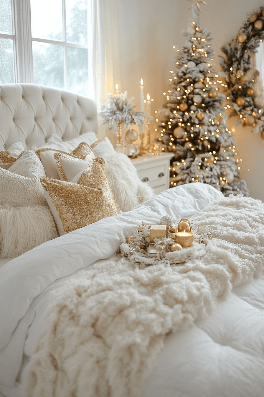 Bask in elegance with a gold-and-white Christmas bedroom that feels like waking up inside a snowflake. Crisp linens, metallic details, and soft lighting create a radiant atmosphere. Gold-tinged ornaments or pillow trim add dimension. It’s luxury without excess. Infuse your bedroom with quiet opulence and let every morning feel golden.
