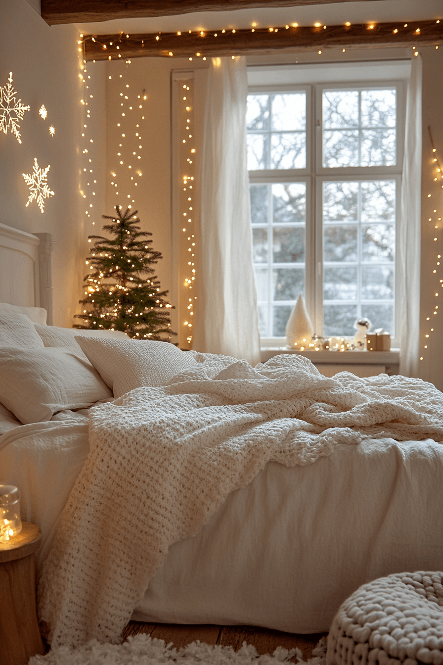 Embrace winter’s beauty with a Christmas bedroom that sparkles like a fresh snowfall. Crisp white bedding, silver accents, and touches of frosted blue create a space that feels serene and airy. A faux-fur throw and twinkle lights amplify the peaceful glow. Add frosted pinecones or snowflake ornaments for a soft shimmer. Turn your room into a snowy retreat where tranquility meets festive wonder.