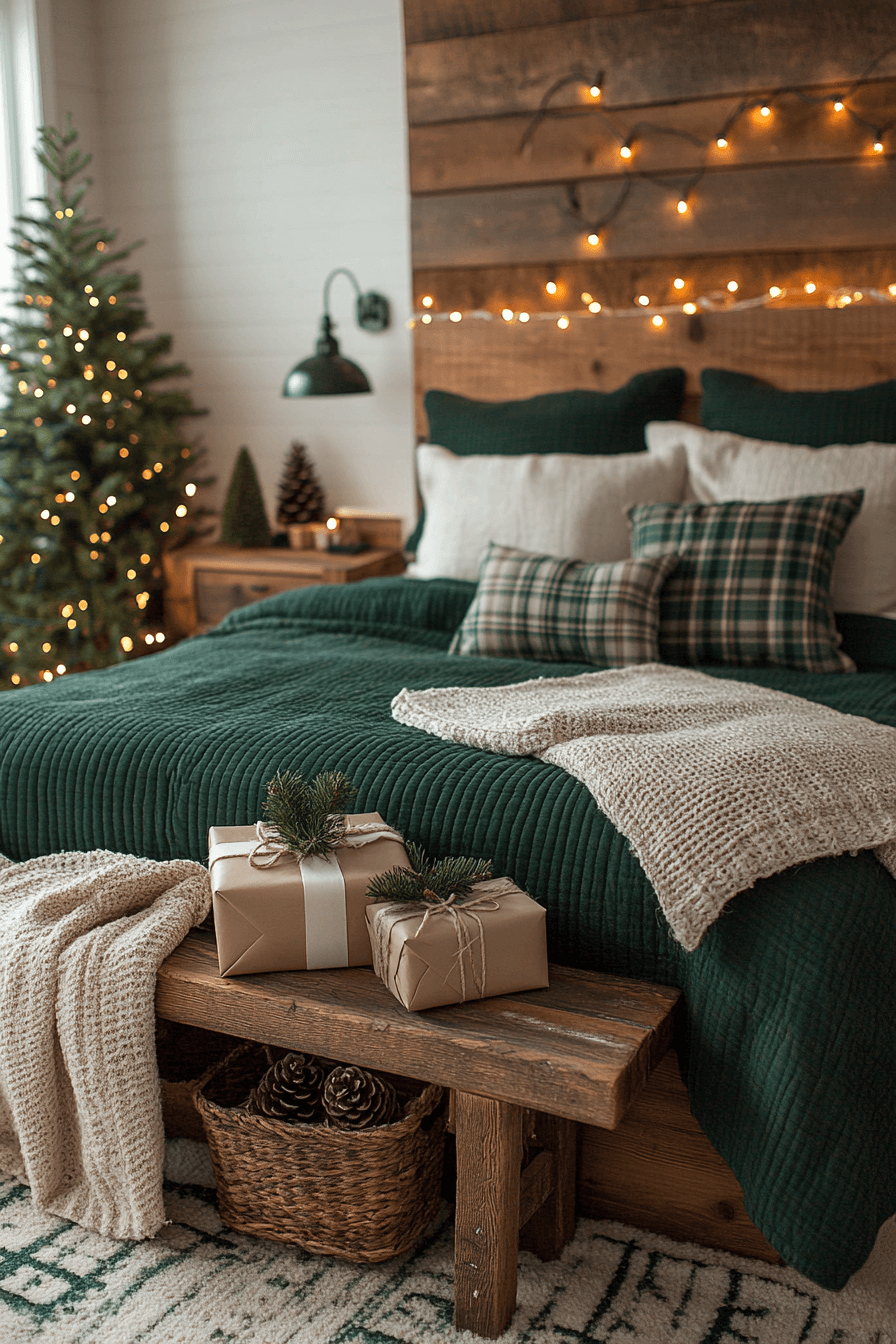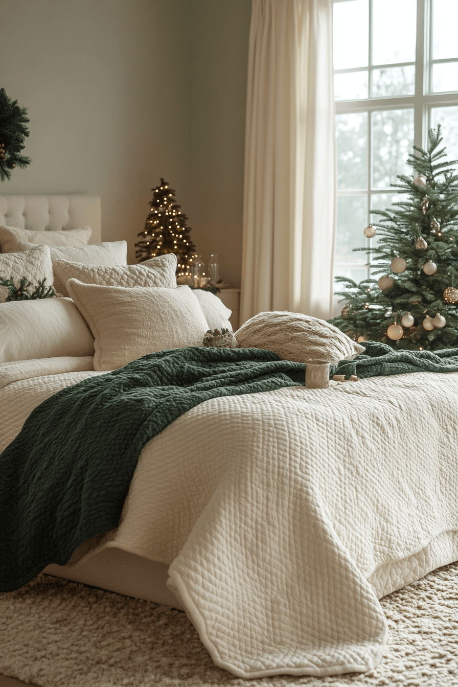 Go natural with a pine-green and white Christmas bedroom inspired by evergreen charm. White bedding keeps the look clean while green accents bring life and freshness. Add garlands or a simple pine wreath for depth. The effect is crisp, classic, and organic. Celebrate nature’s beauty and wake up in a forest-inspired holiday retreat.