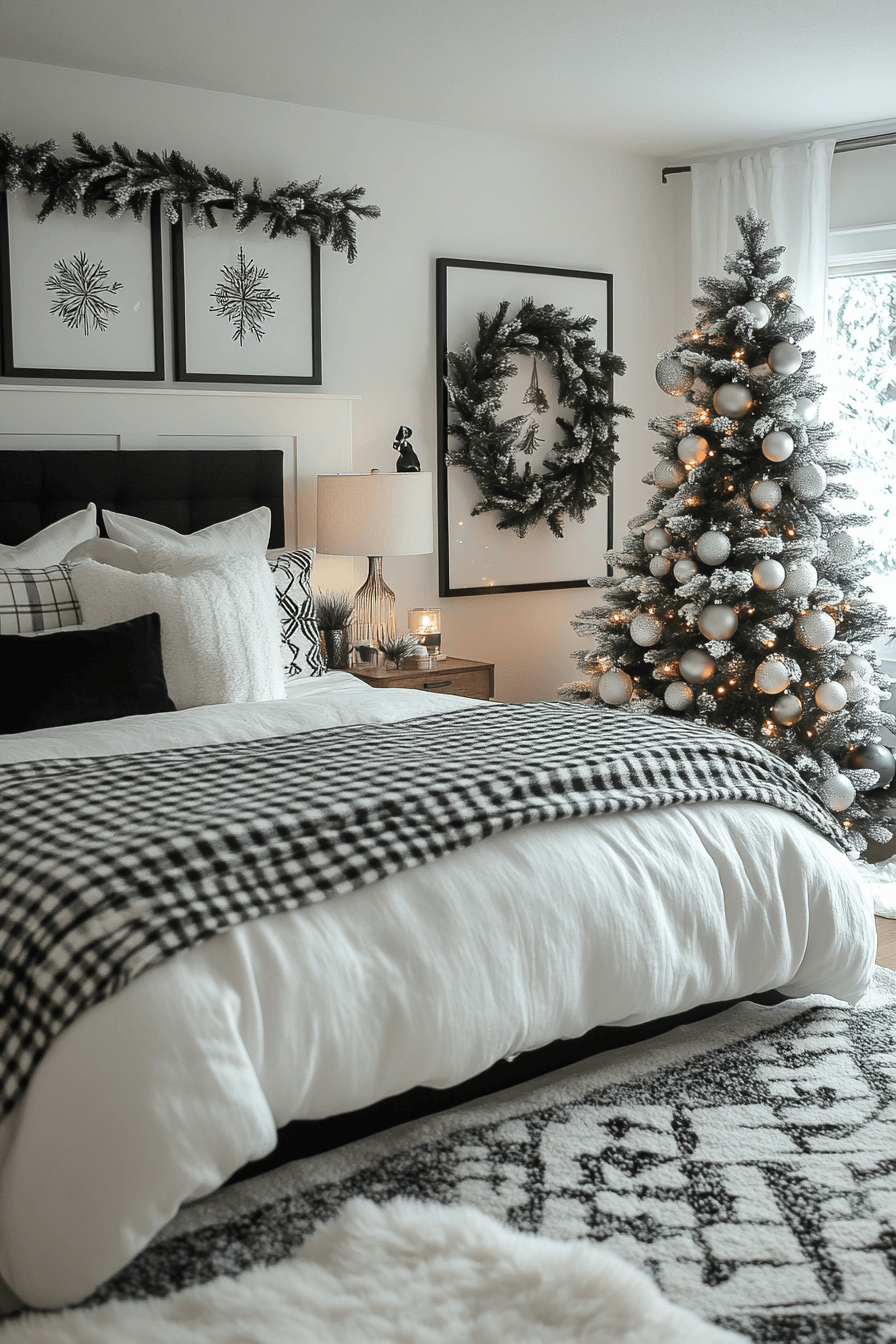 Play with contrast using a black-and-white Christmas bedroom that radiates sophistication. Use geometric patterns or buffalo check for visual rhythm. Add silver or glass accents for depth and polish. It’s edgy yet cozy. Strike the perfect balance between classic and contemporary with this striking holiday look.