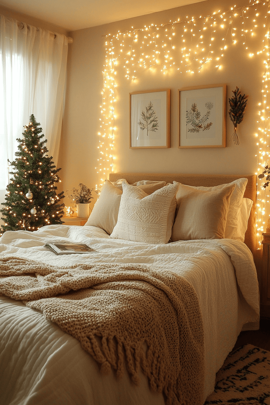 Let delicate string lights turn your Christmas bedroom into a glowing dreamscape. Hang them above the bed, frame a mirror, or layer them behind gauzy curtains. The effect is soft, enchanting, and timeless. Pair with neutral tones for balance. Drift into peaceful slumber surrounded by the shimmer of gentle light.