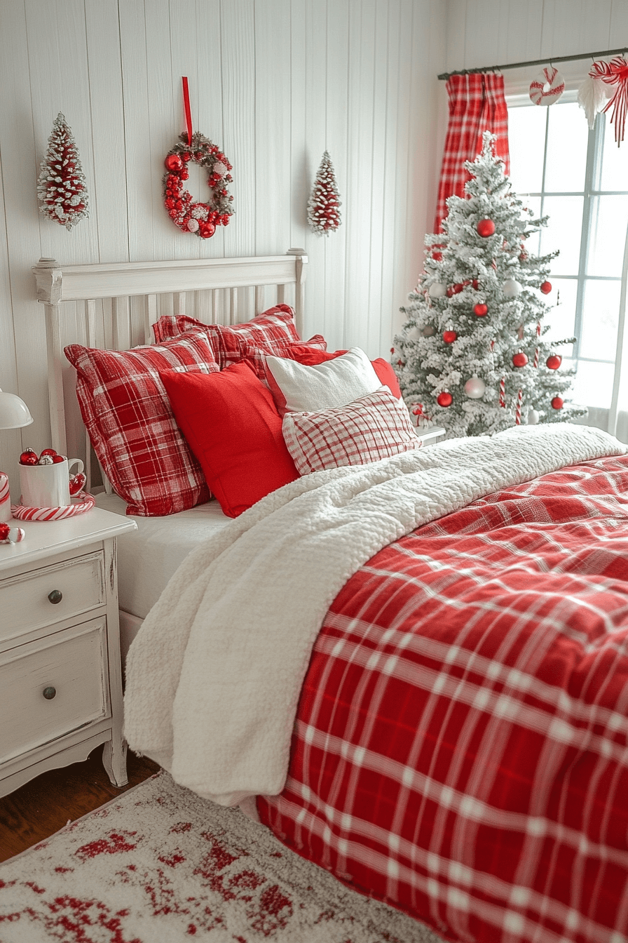 Add personality and pattern with a red-plaid Christmas bedroom full of cozy nostalgia. Bold bedding and simple white accents keep the space lively but balanced. A green wreath or rustic basket adds organic charm. It’s vibrant without feeling cluttered. Give your bedroom a plaid-powered makeover and capture that timeless cabin comfort.