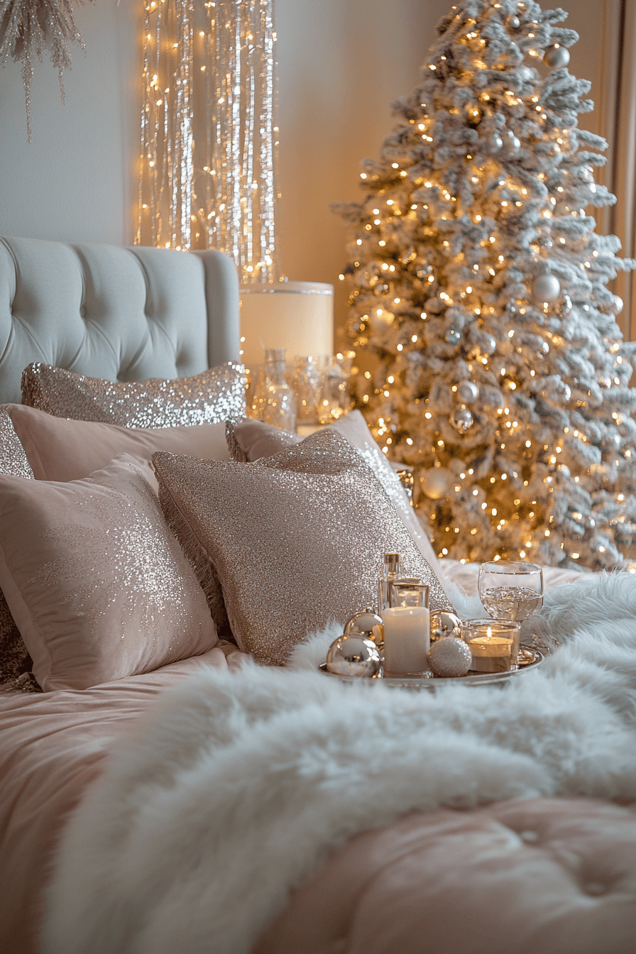 Turn up the glamour with a Christmas bedroom that shimmers in metallic brilliance. Pair velvet bedding with mirrored accents and gold or rose-gold details for upscale sparkle. A statement chandelier or sequin pillow brings luxurious glow. Soft candlelight makes the space feel intimate and warm. Indulge in elegance this season and make your bedroom your most radiant retreat.